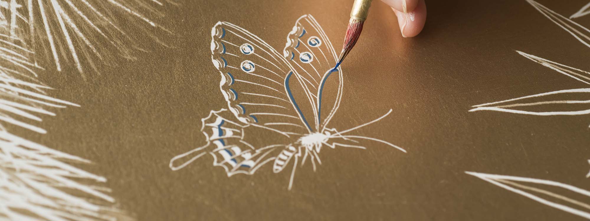 Printed onto a hand-gilded paper background and finished with hand-painted details.