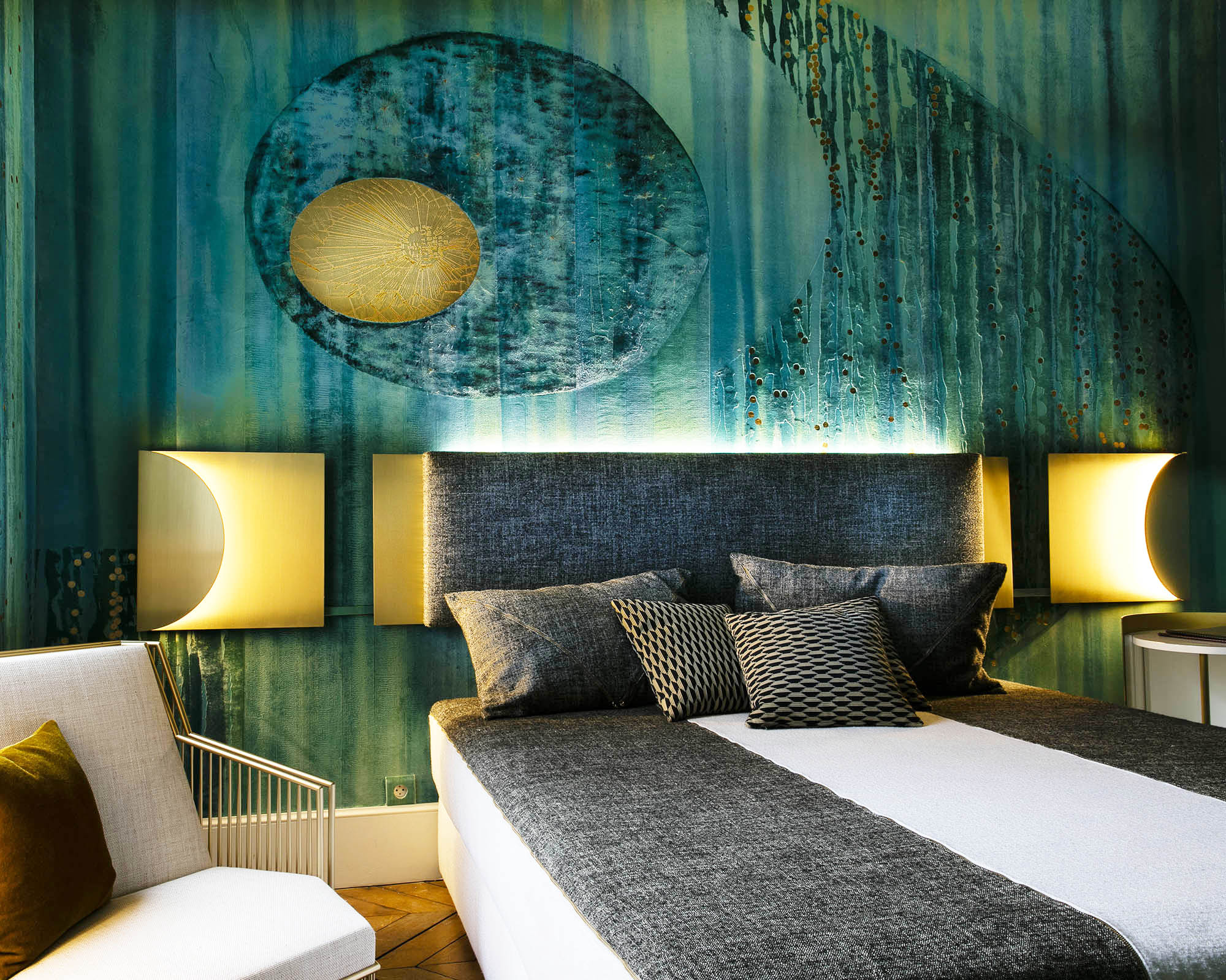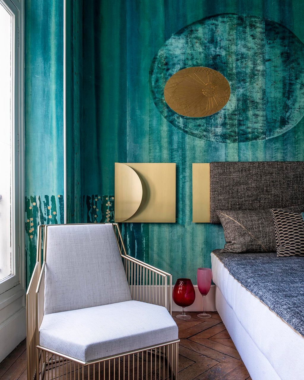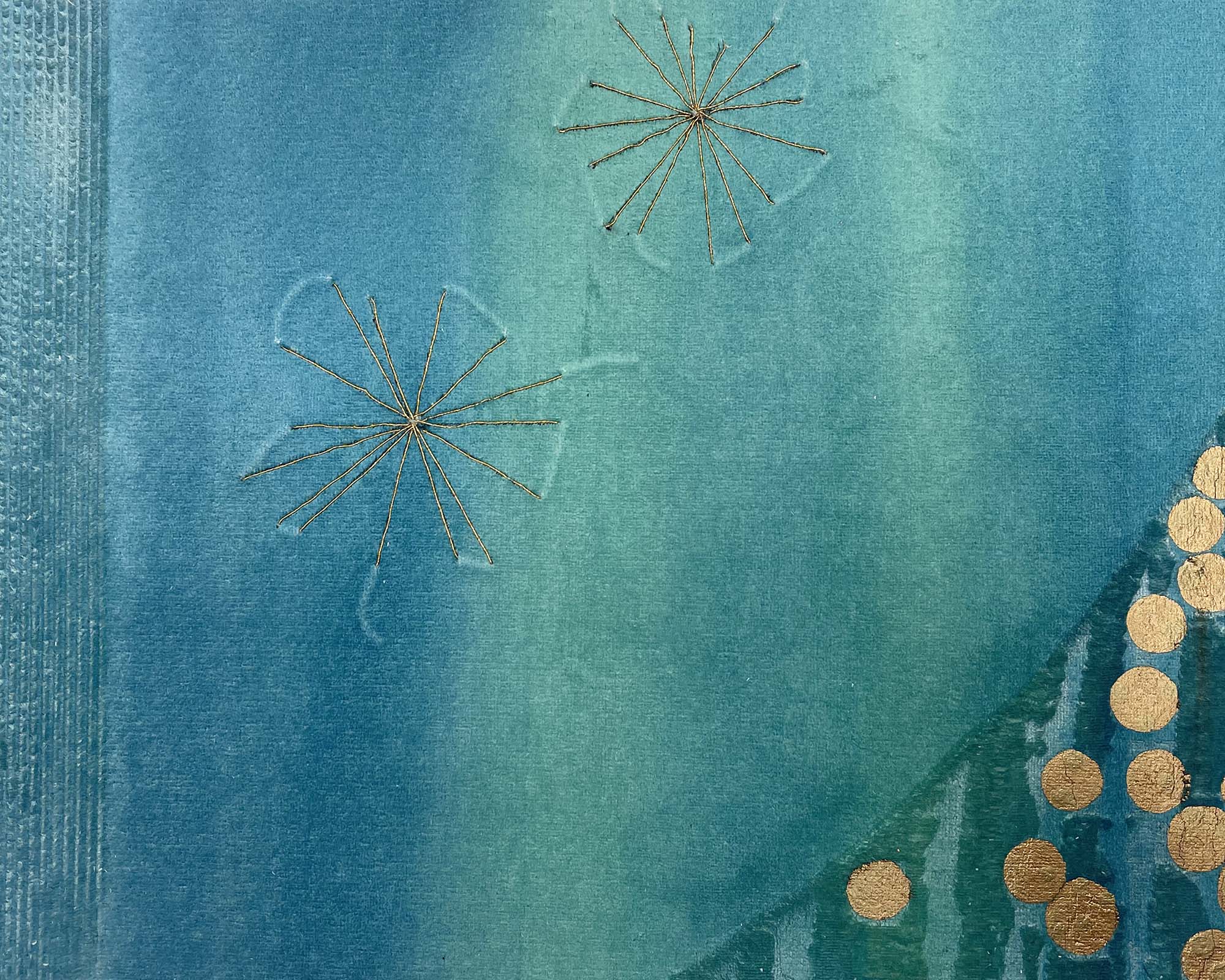 A fresh fusion of aquamarine hues glide across the velvet panels, and curved motifs add shape otherwise vertical composition. A scattering of gold embellish this unique colourway.