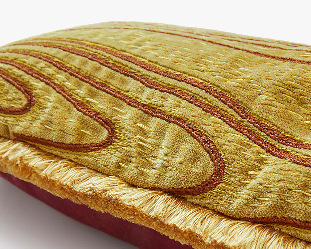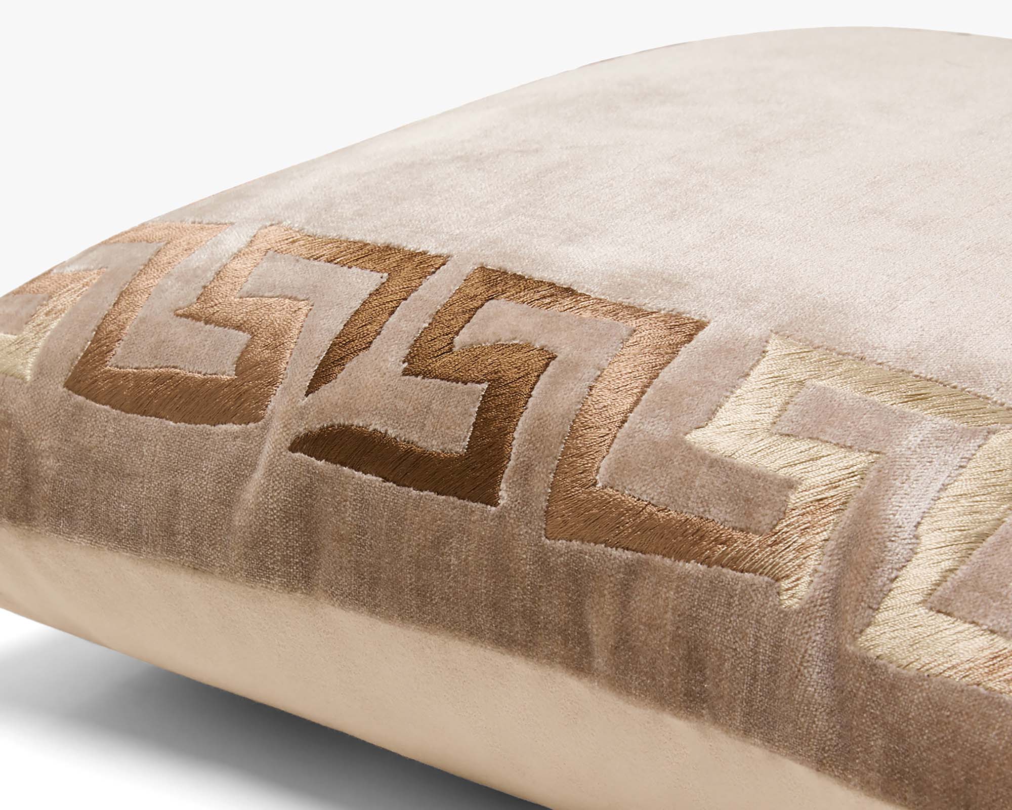 Drawing inspiration from the expressive brushwork of fashion illustrator, Christian Bérard, Greek Key interprets a classic motif through delicate hand- embroidery. Lustrous cotton threads create a dimensional quality when worked across velvet, resulting in a richly tactile finish.