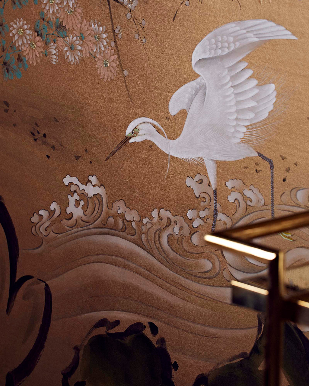 The Buronzu colourway is hand-painted on metallic tea paper and conjures traditional gilded Japanese screens, providing a lavish backdrop for Haiku’s exquisitely rendered flora and fauna.