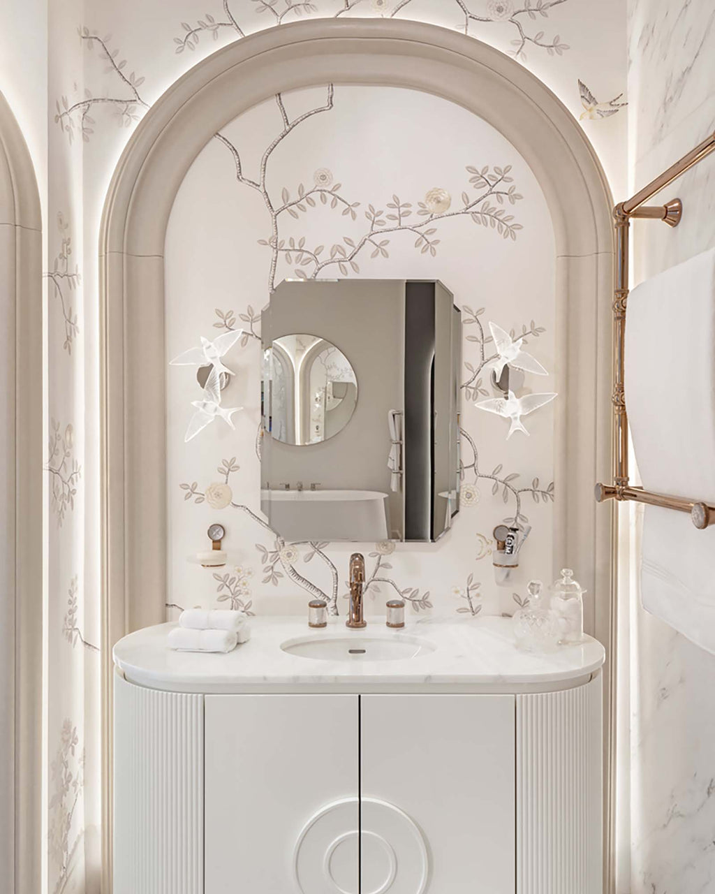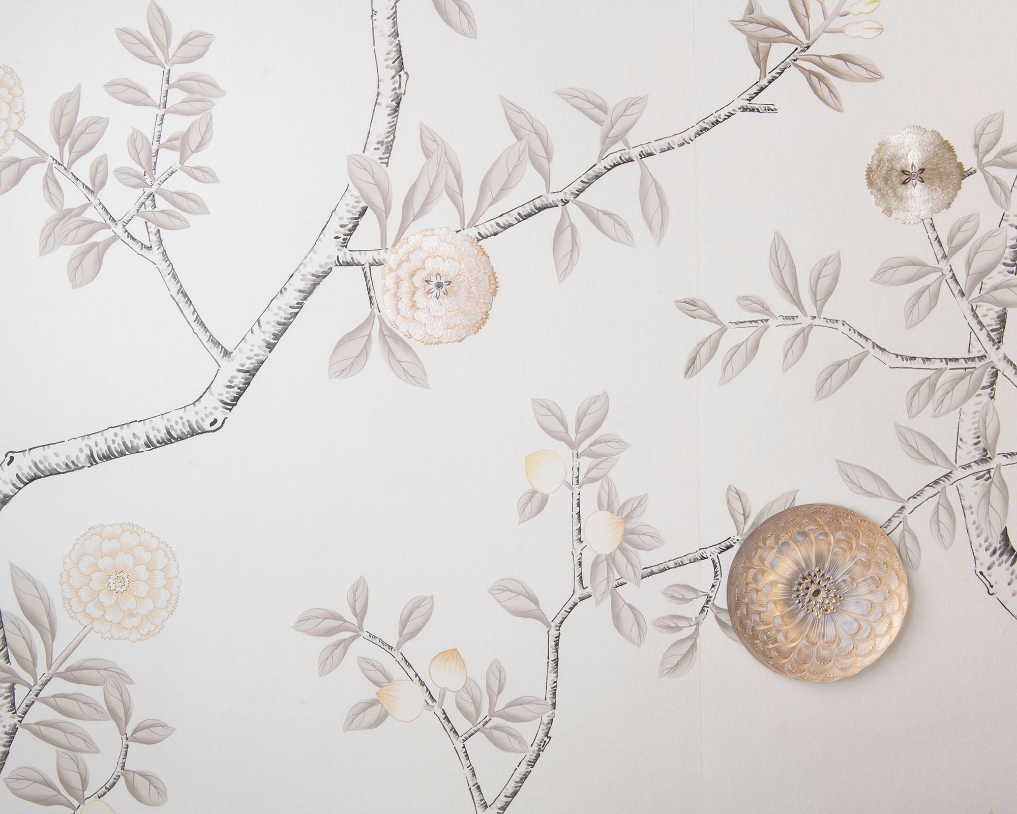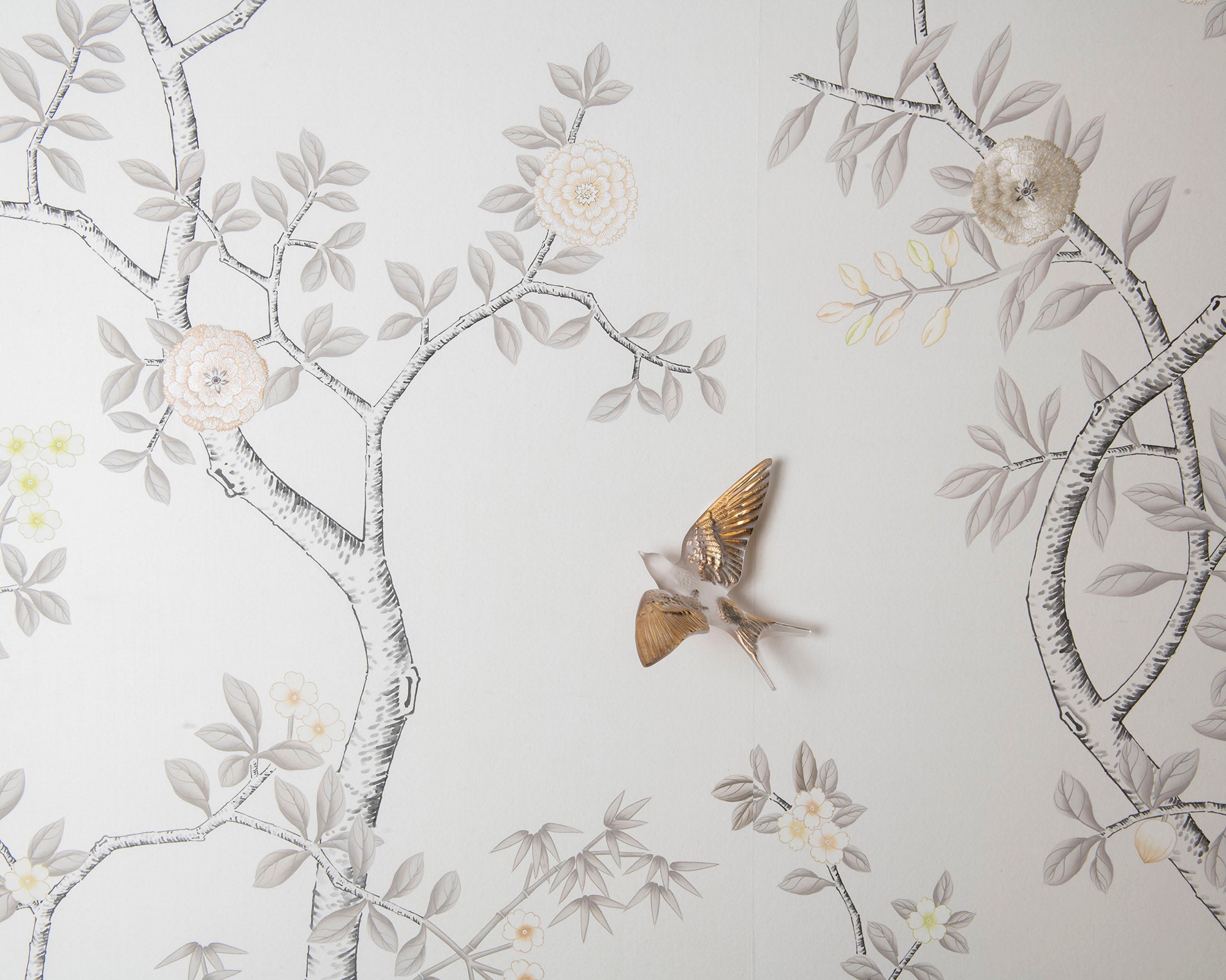 Our collaboration with French crystal house Lalique, Hirondelles is handcrafted silk wallcovering, expertly hand-painted and embroidered by our skilled artists to incorporate Lalique crystal.
