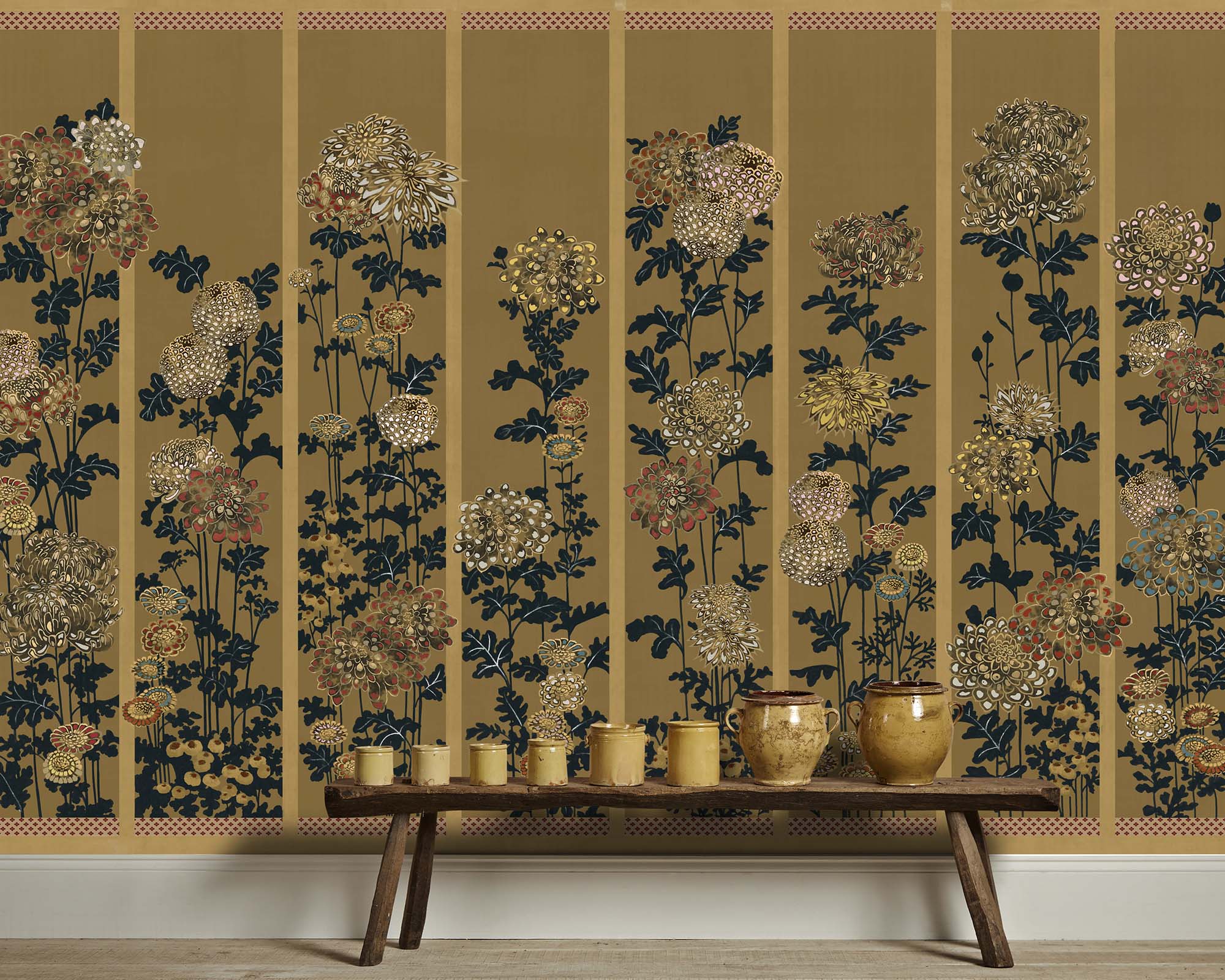 The British Aesthetic Movement owes much of its inspiration to the art of Japan, and this particular design draws from both Japanese art and Europe’s infatuation with form. A strikingly bold layout, Kiku presents several individual panels, each featuring a crisp, screen-printed trim that works to contain elegantly rendered chrysanthemums. Salt is sprinkled directly onto the wet paint, causing it to disperse in interesting ways – a technique often used in ceramics. Hand-painted in a block style, with no embroidery, Kiku’s leaves and blossoms sit forward of the printed trim, further emphasising the graphic nature of this highly decorative wallcovering.