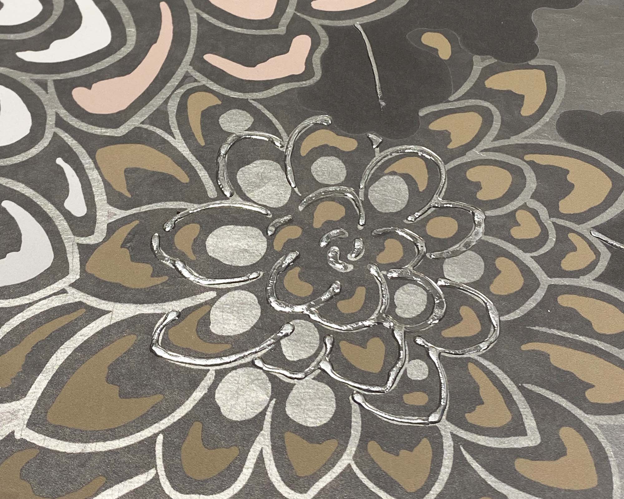 Hanami, a backdrop of silver-gilded paper, adorned with blossoms in dusky pink, light chestnut, and gunmetal grey tones. Enhanced with silver-foiled details, this wallcovering exudes opulence.