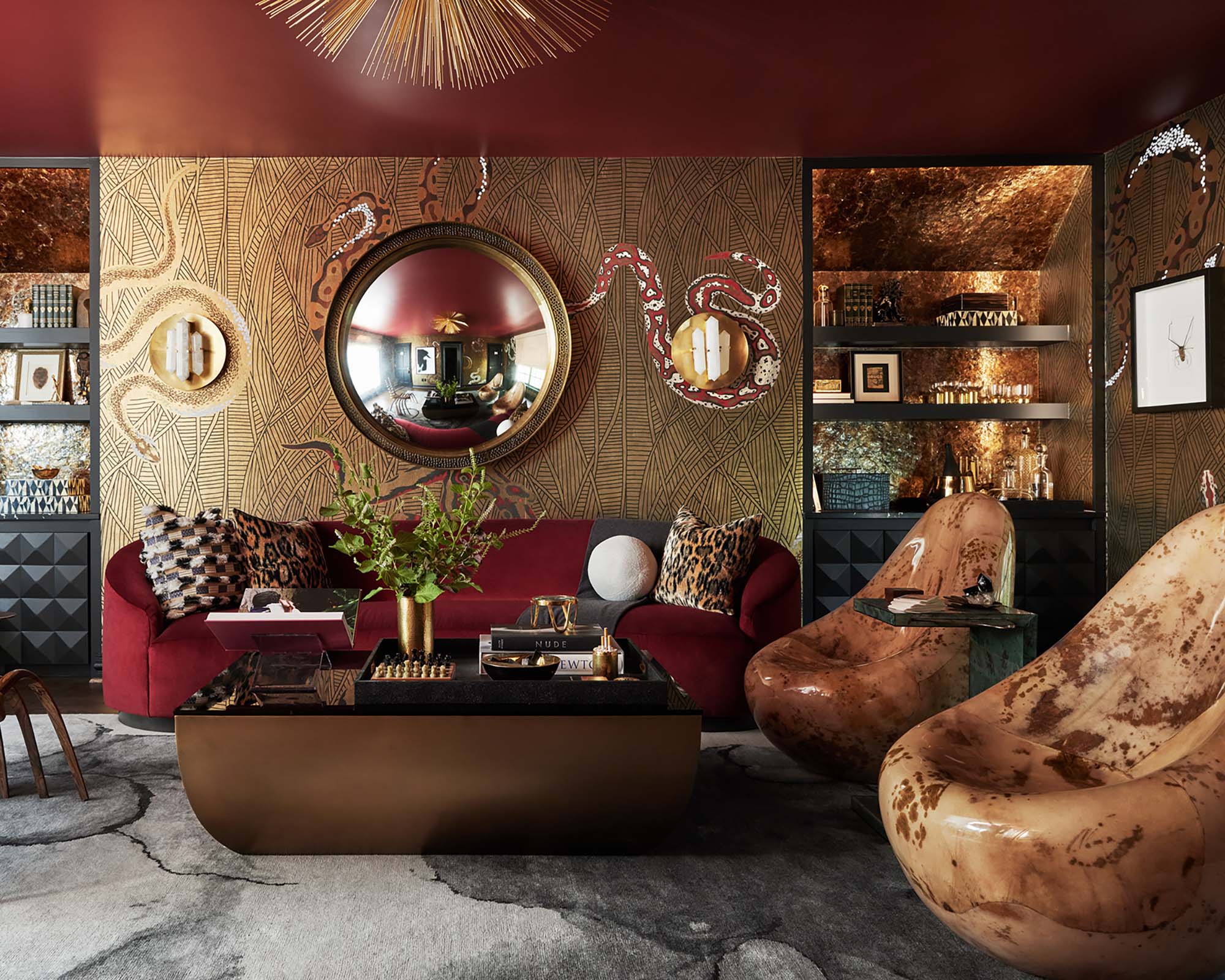 • Inspired by the beautiful maquettes and paintings created by Cartier, Lalique and Boucheron in the 1930's, Les Boas is a bold, graphic design. The natural adornment present in the pattern of reptiles is enhanced with hand-painted touches. The design is printed on a gilded ground.
