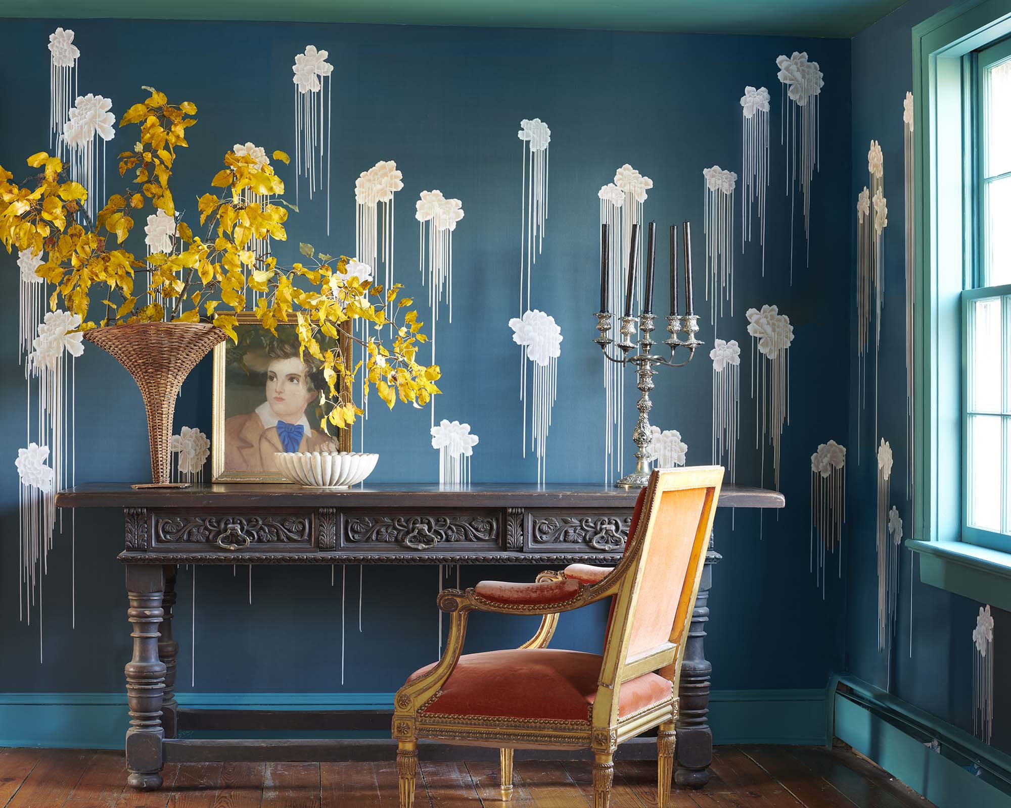 The design “Märchen” (German; meaning fairy tale) is inspired by a combination of Nicole Fuller’s childhood memories of enchanting fairy tales, her favourite flower, peonies, and the artist Cy Twombly. These three influences flow into a rich visualisation of Nicole’s imagination, forming beautiful dripping peonies clustered across the silk wallcovering.
