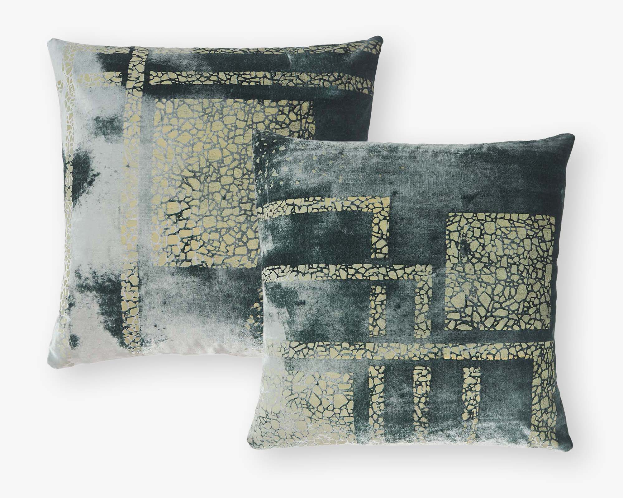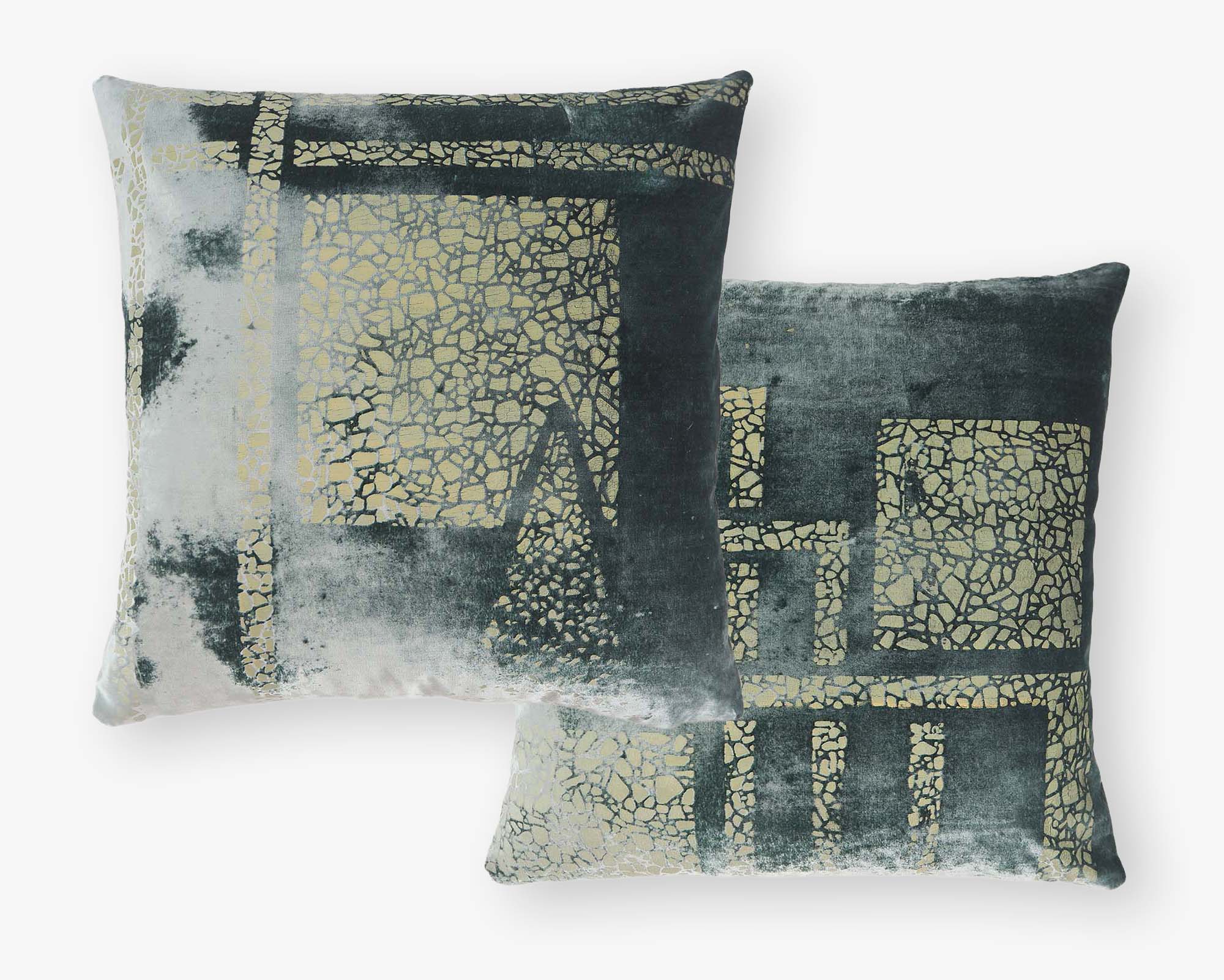 Seaweed green patterns dance across a muted dusty blue velvet ground. The delicately crackled textures suggest weathered urban surfaces, bringing contemplative elegance with an industrial edge.