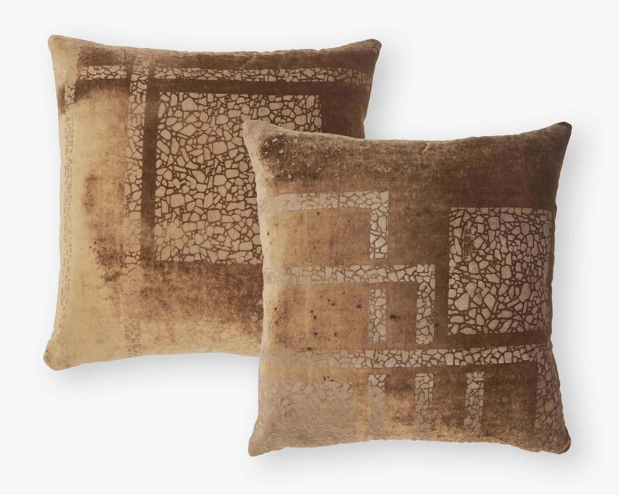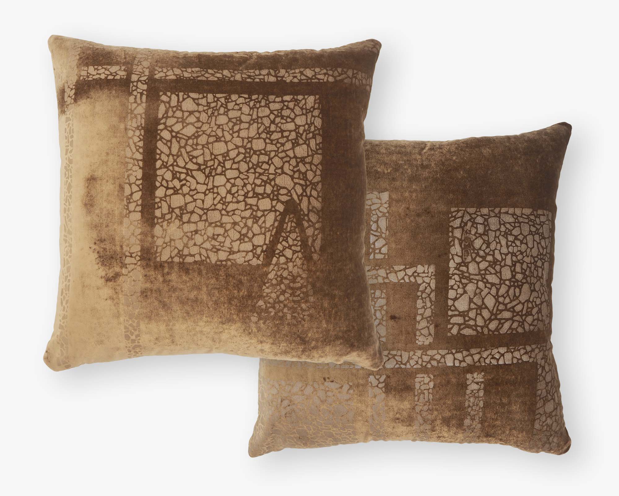 An abstract design composition featuring bold geometric forms and intricate crackled textures evokes the layered complexity of urban landscapes. Each piece is screen-printed on velvet, combining structured blocks with organic surface details to capture the dynamic energy of metropolitan life.