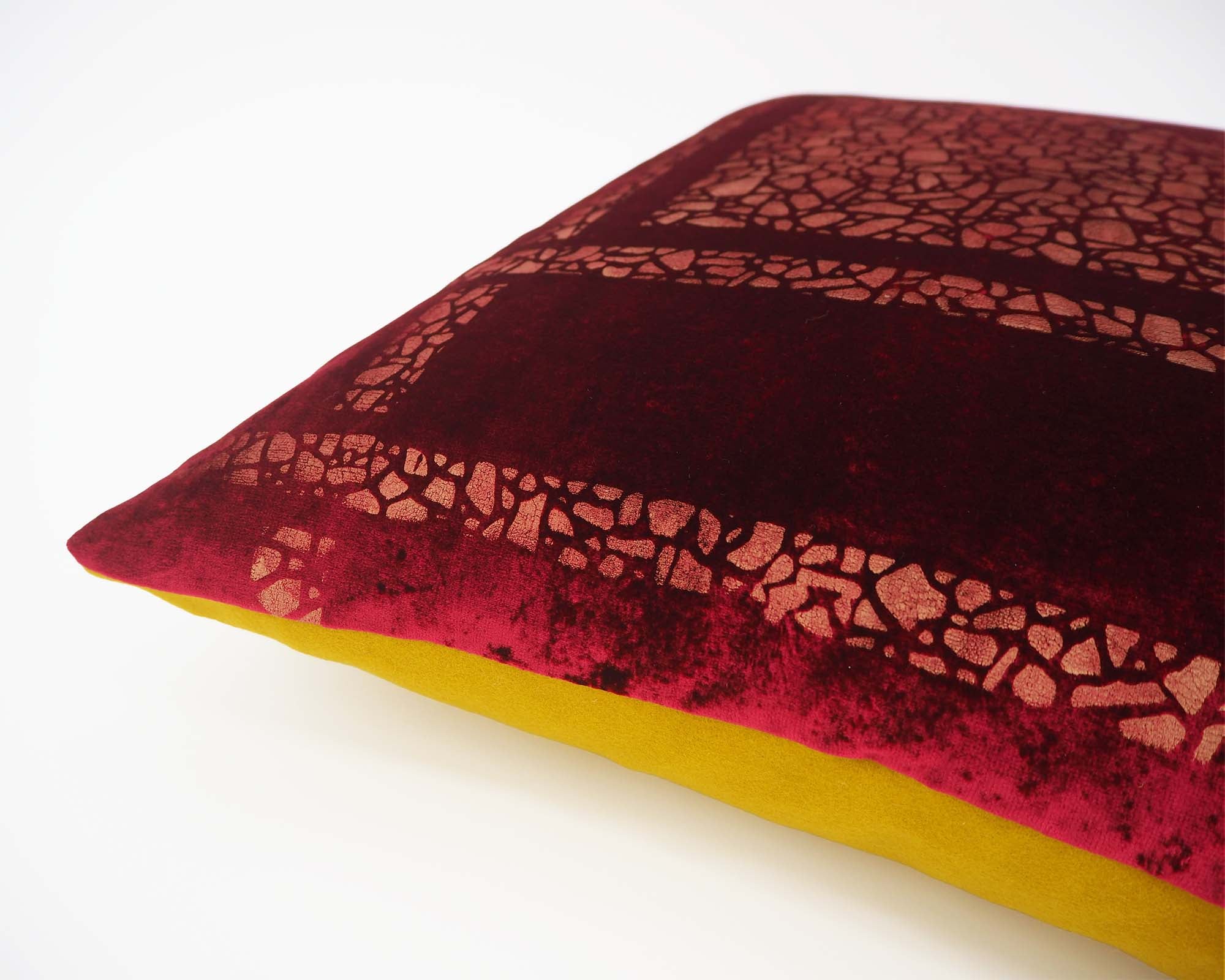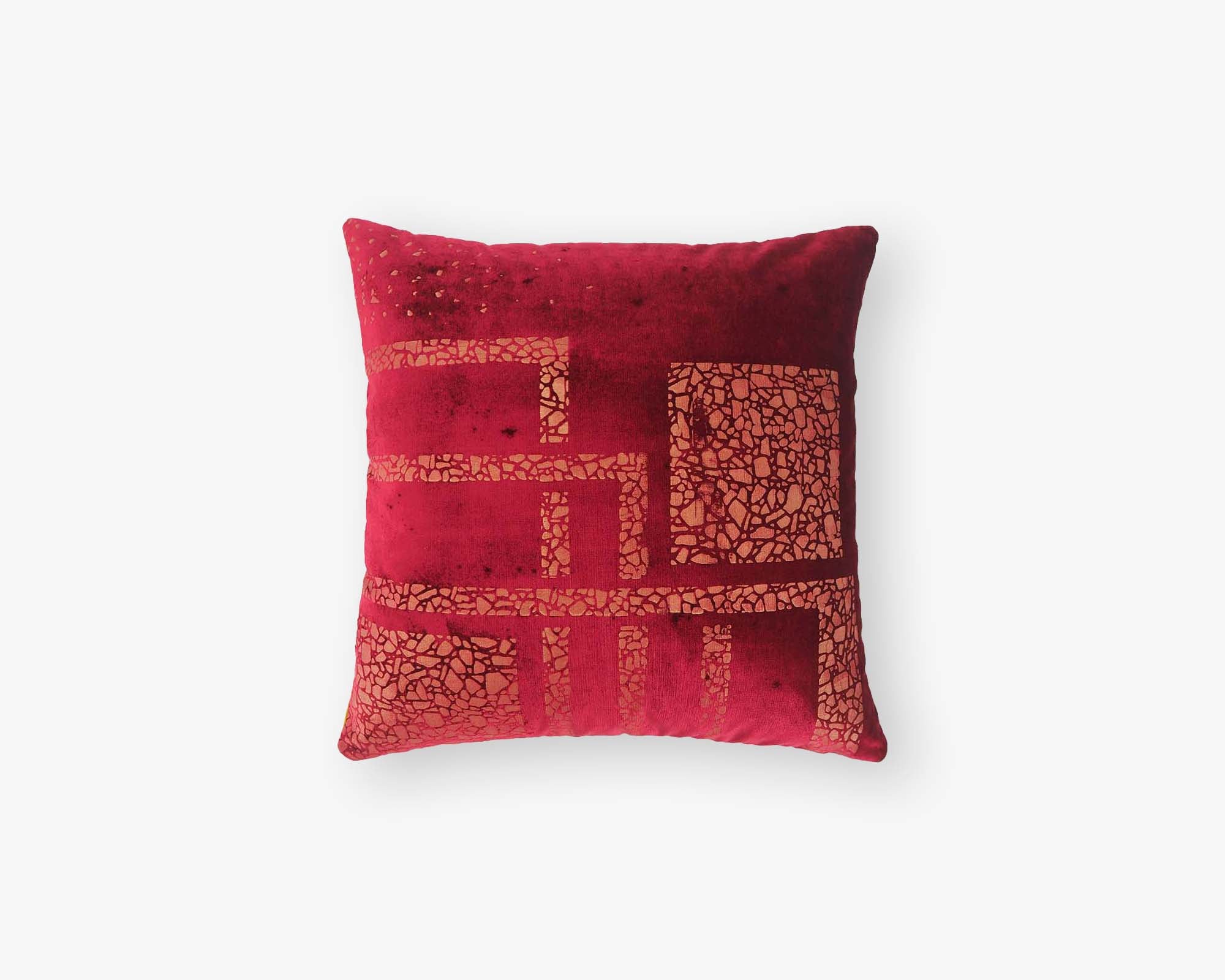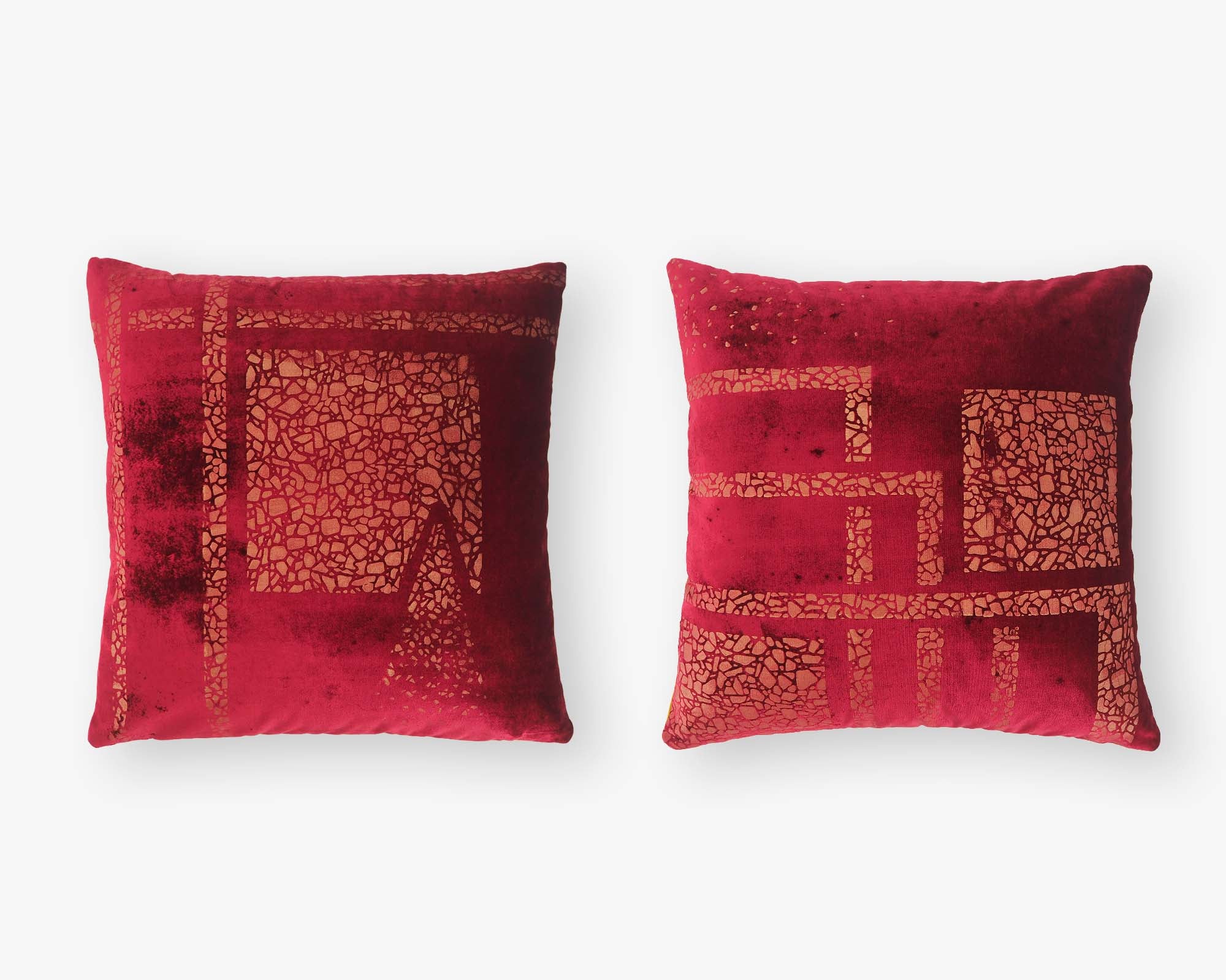 An abstract design composition featuring bold geometric forms and intricate crackled textures evokes the layered complexity of urban landscapes. Each piece is screen-printed on velvet, combining structured blocks with organic surface details to capture the dynamic energy of metropolitan life.