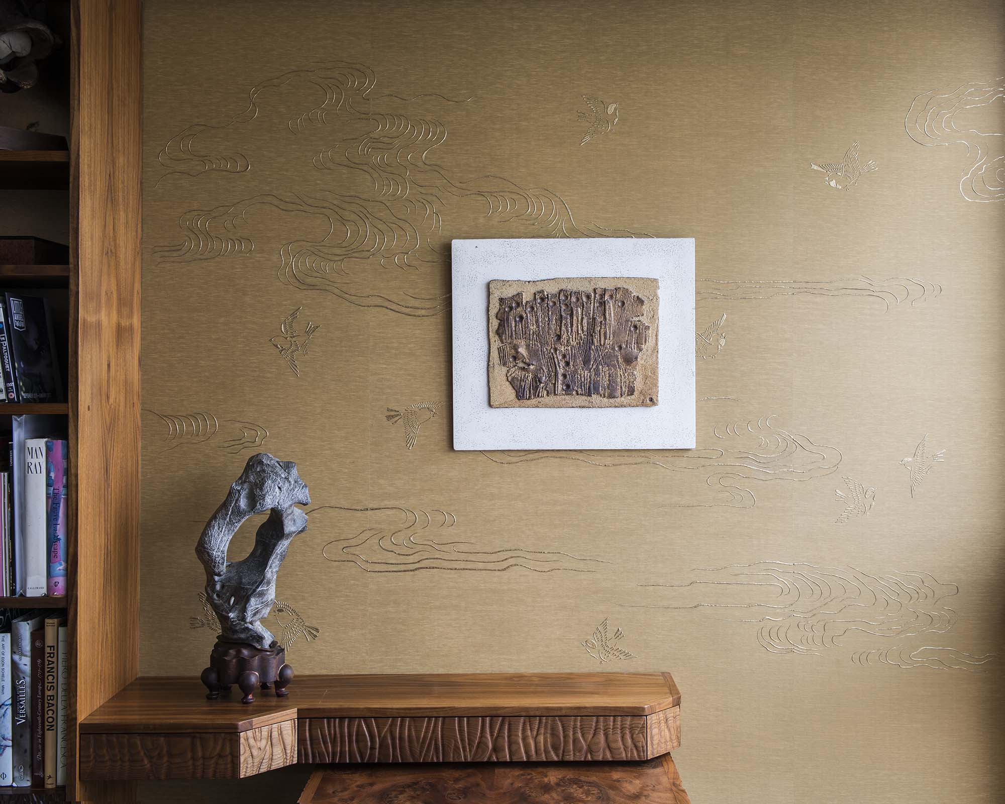 Aso is a celebration of ‘tone on tone’ and is painted onto faille – a silk-linen mix whose dry texture provides a contemporary backdrop to the classically Japanese details.