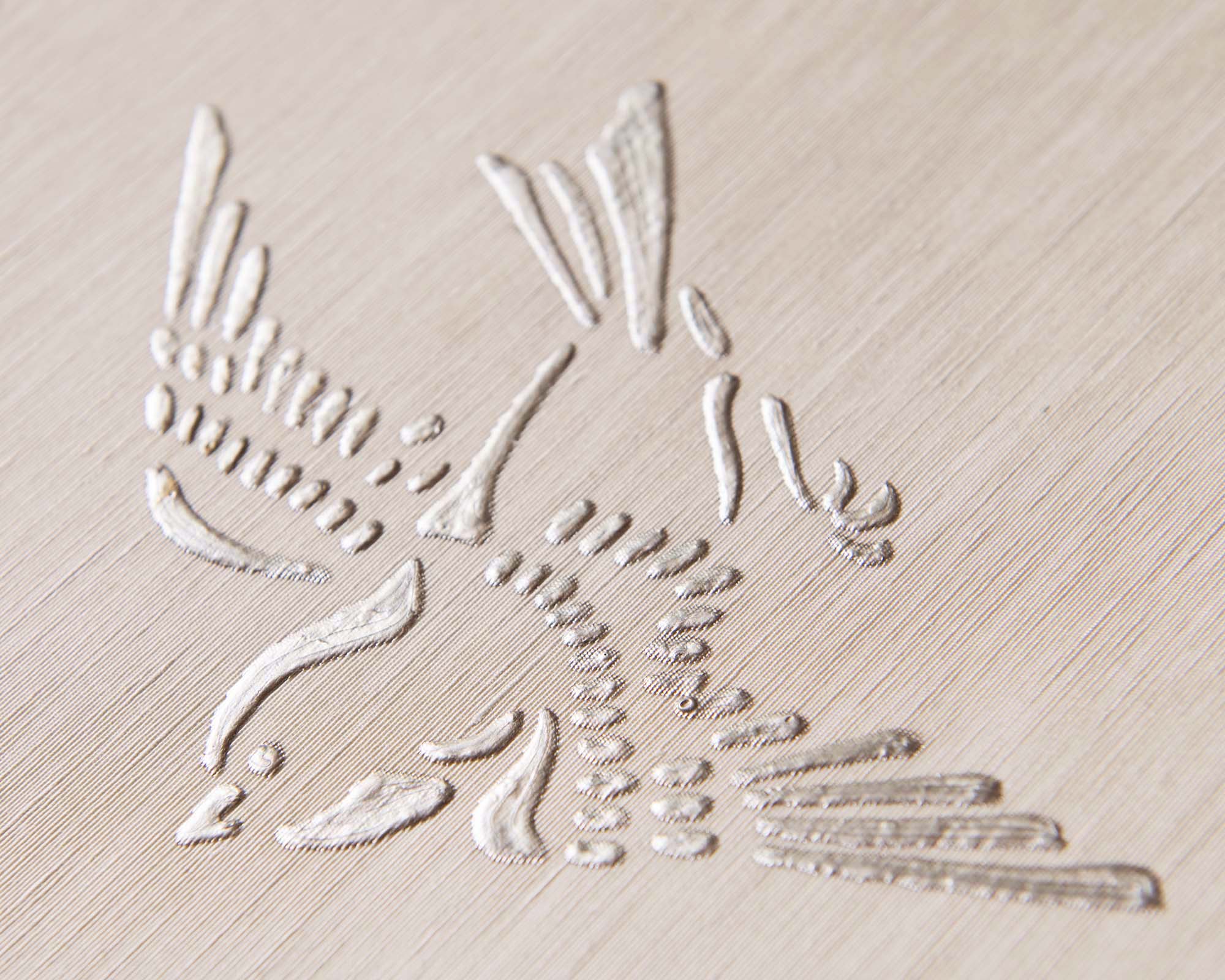Inspired by Japanese kimono patterns, these playful sparrows painted in our raised gesso dip and dive between wispy clouds. The beauty of this design is its minimalism; the relief paint effect catches the light, adding movement and depth to an otherwise simple graphic.