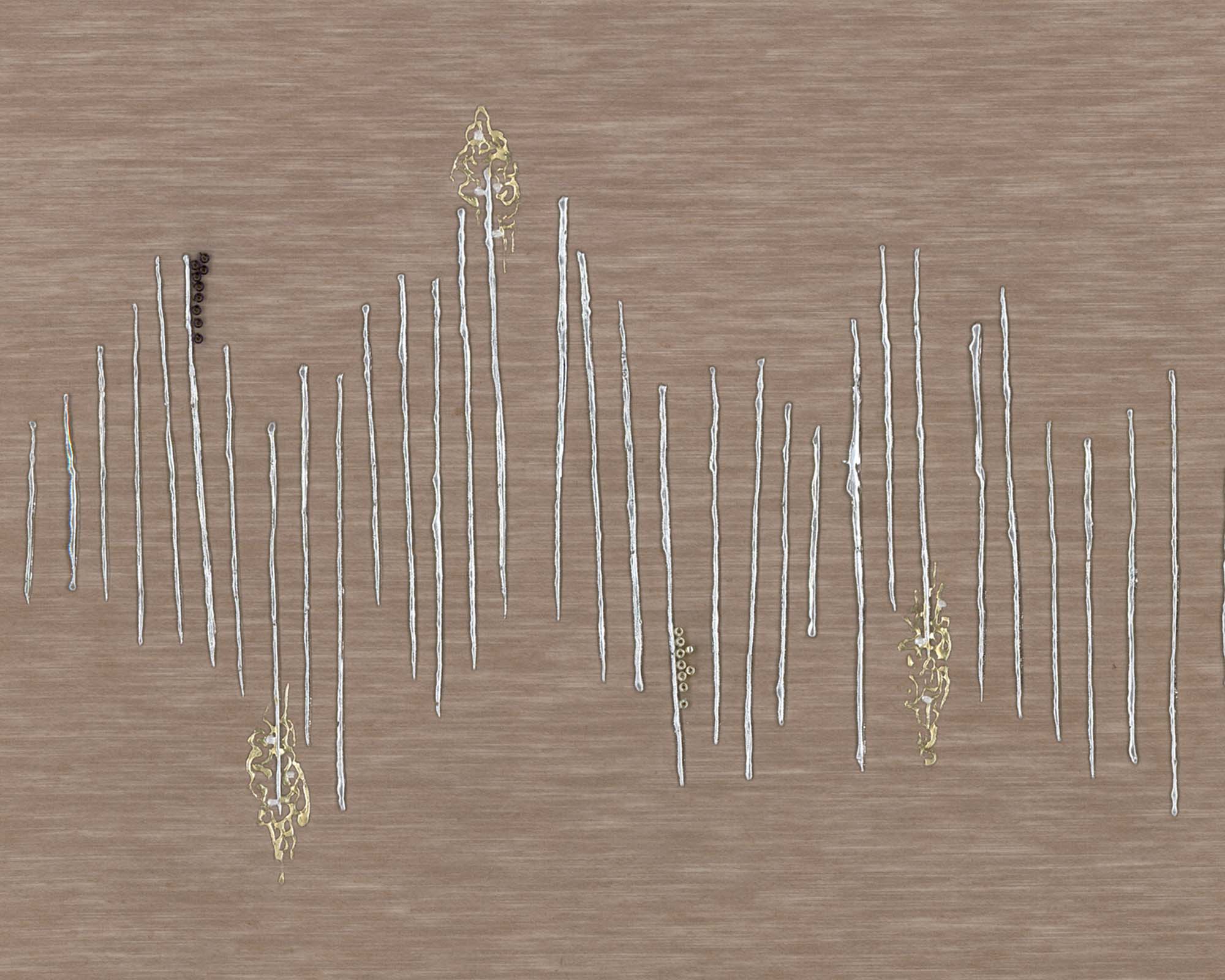 Soft and understated, Blake is set on pearl grey faille silk with gentle slub texture. Silver foiled lines intersect with delicate emerald-green beading, echoing the accents found in our Huxley colourway.