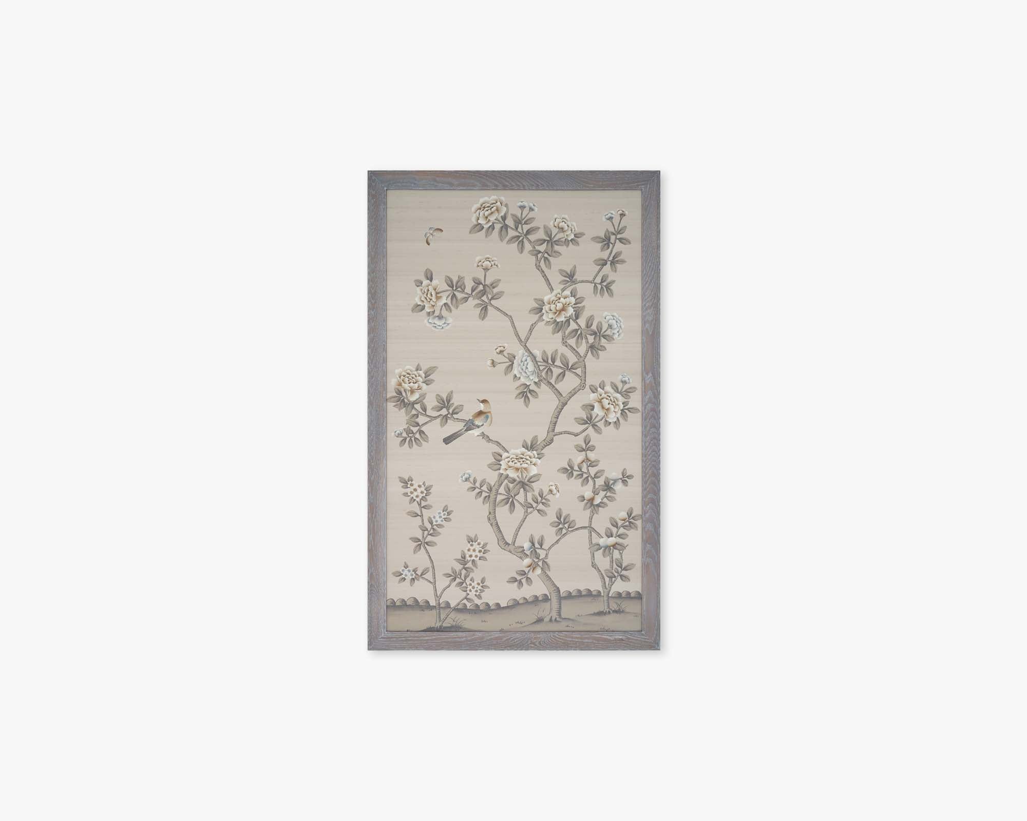 In Blue Haze, a warm taupe Dupion silk ground provides the perfect canvas for a balanced palette of warm neutrals and greys, accented with soft touches of blue.