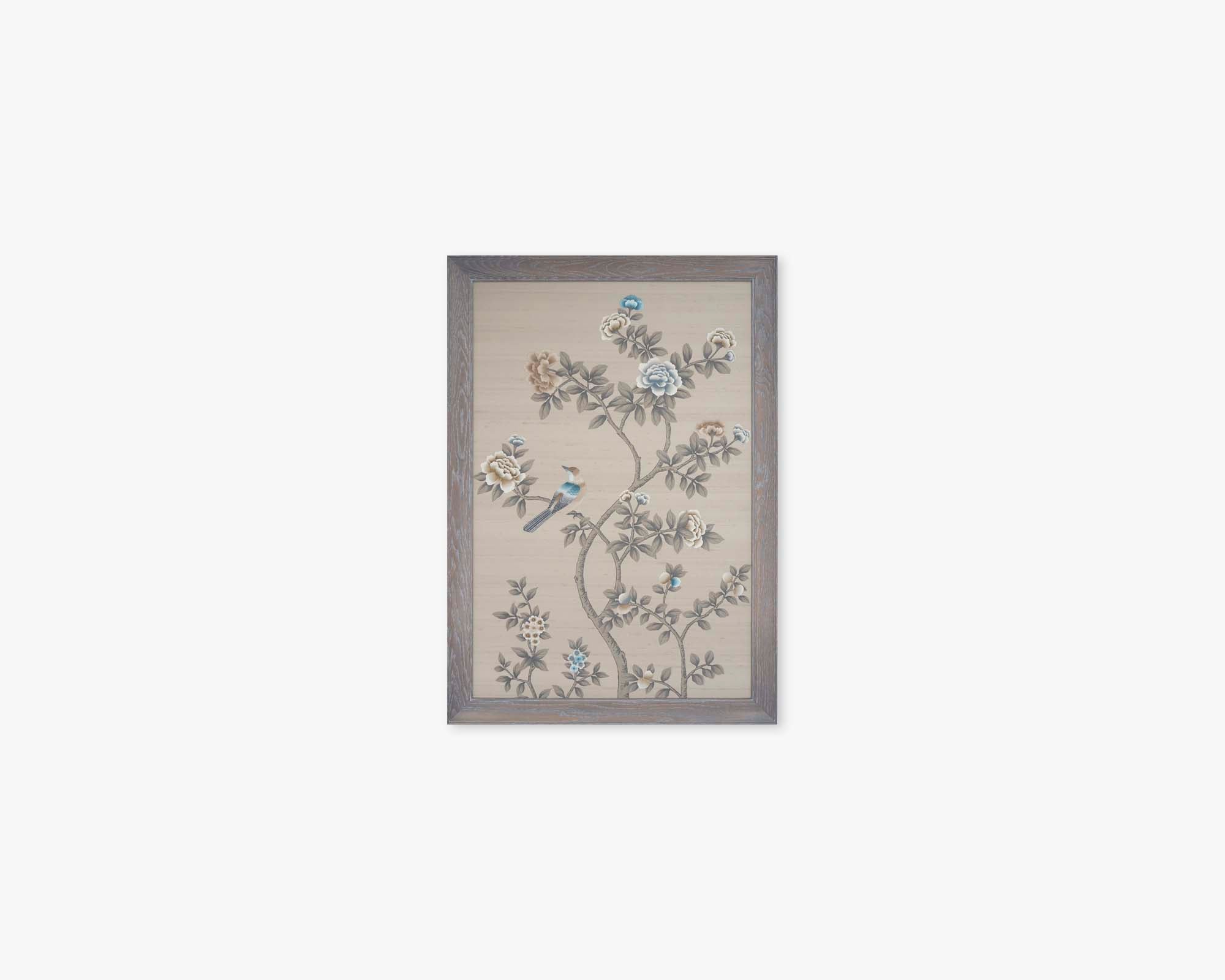 In Blue Haze, a warm taupe Dupion silk ground provides the perfect canvas for a balanced palette of warm neutrals and greys, accented with soft touches of blue.
