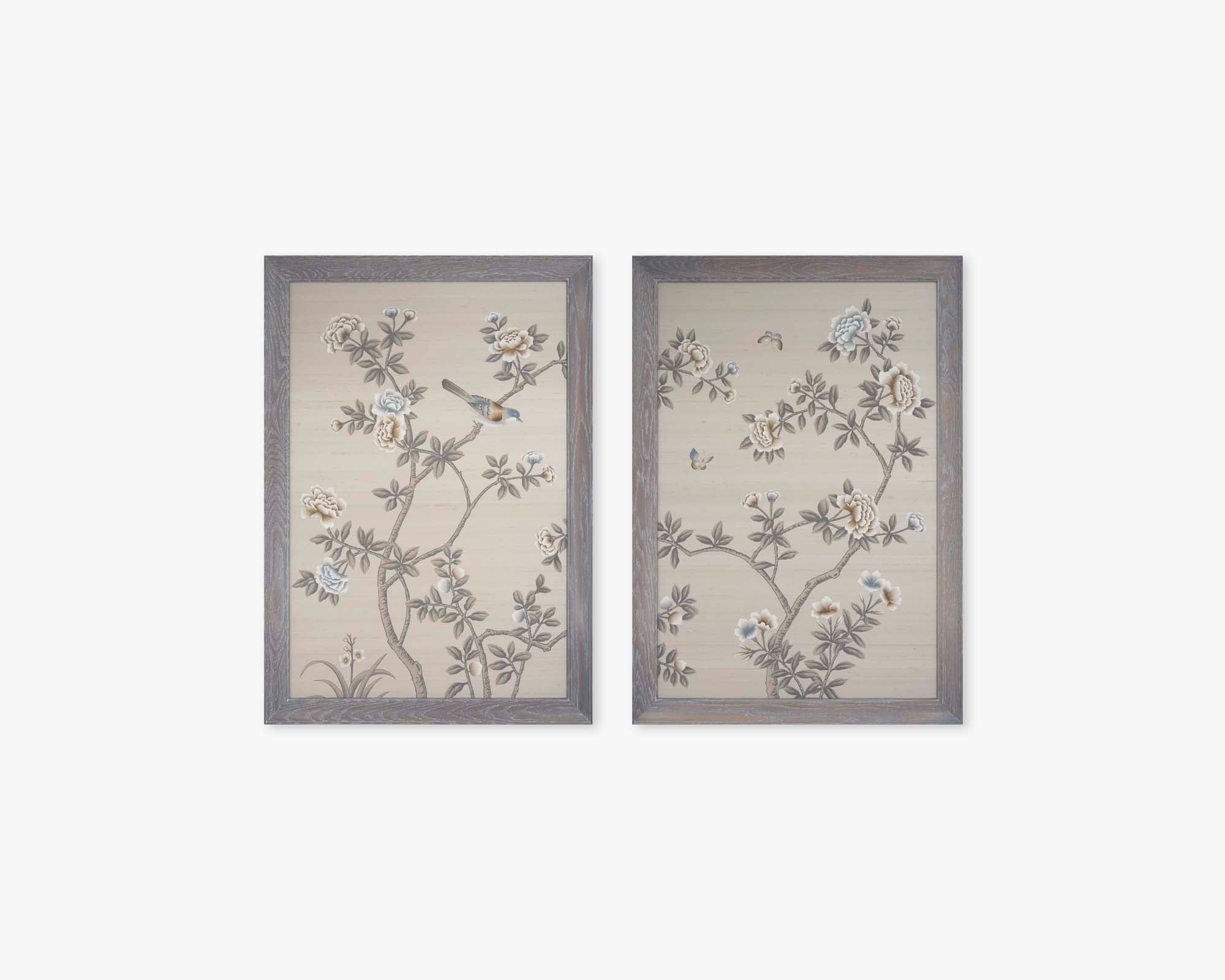 In Blue Haze, a warm taupe Dupion silk ground provides the perfect canvas for a balanced palette of warm neutrals and greys, accented with soft touches of blue.