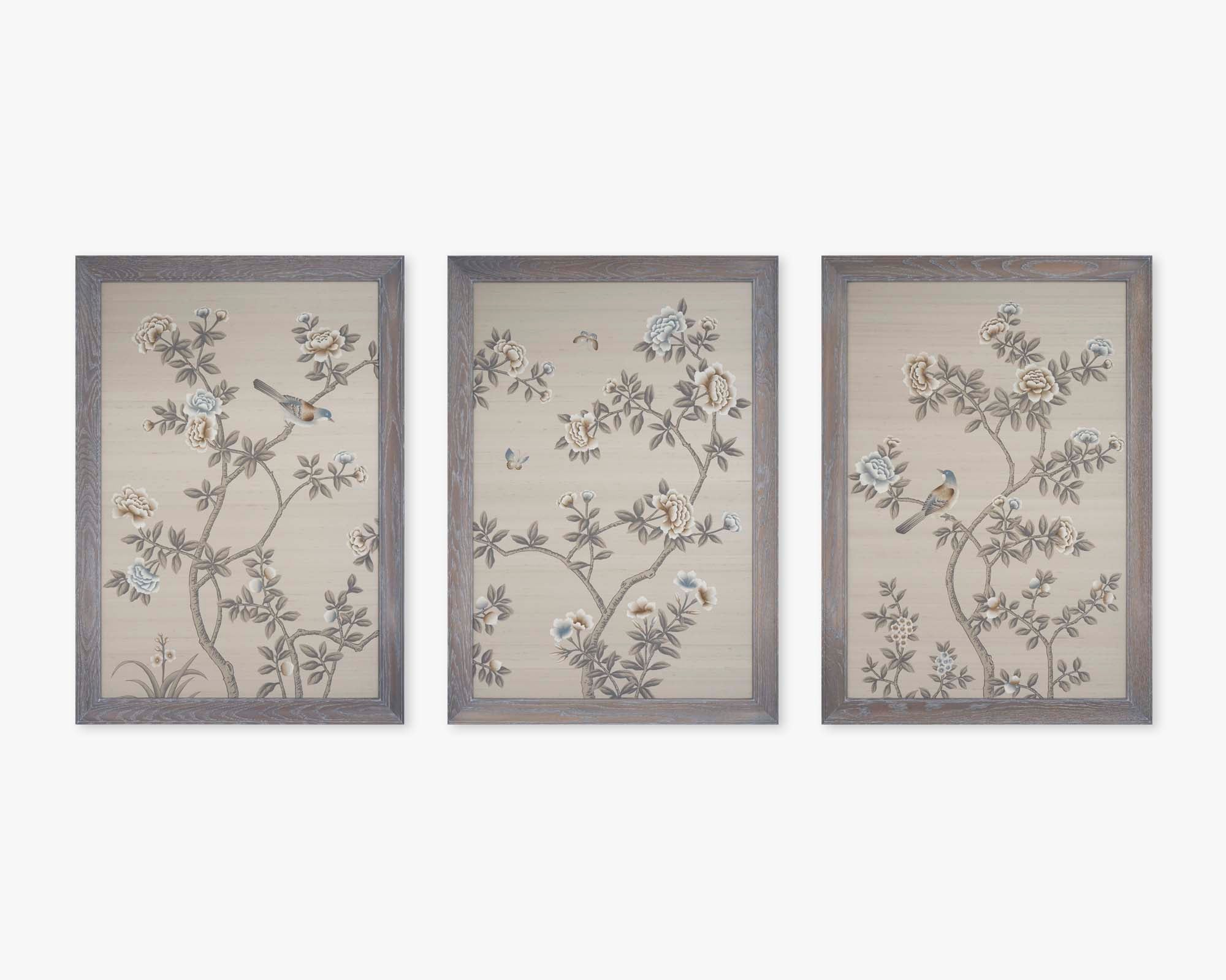 In Blue Haze, a warm taupe Dupion silk ground provides the perfect canvas for a balanced palette of warm neutrals and greys, accented with soft touches of blue.