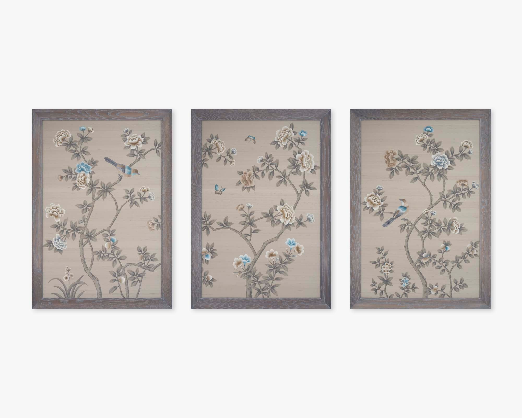 In Blue Haze, a warm taupe Dupion silk ground provides the perfect canvas for a balanced palette of warm neutrals and greys, accented with soft touches of blue.