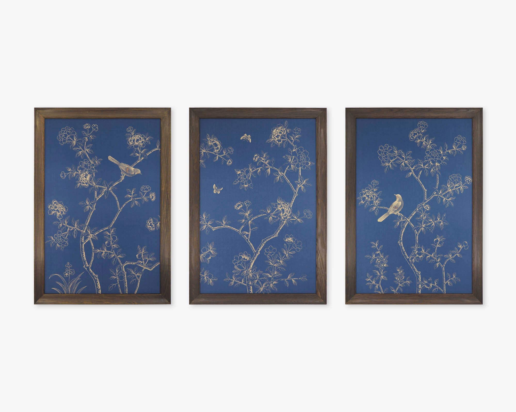 Framed in oak with a pickled finish, soft tones are enriched with dark oil and gold wax, subtly catching the light and accentuating the chinoiserie composition.