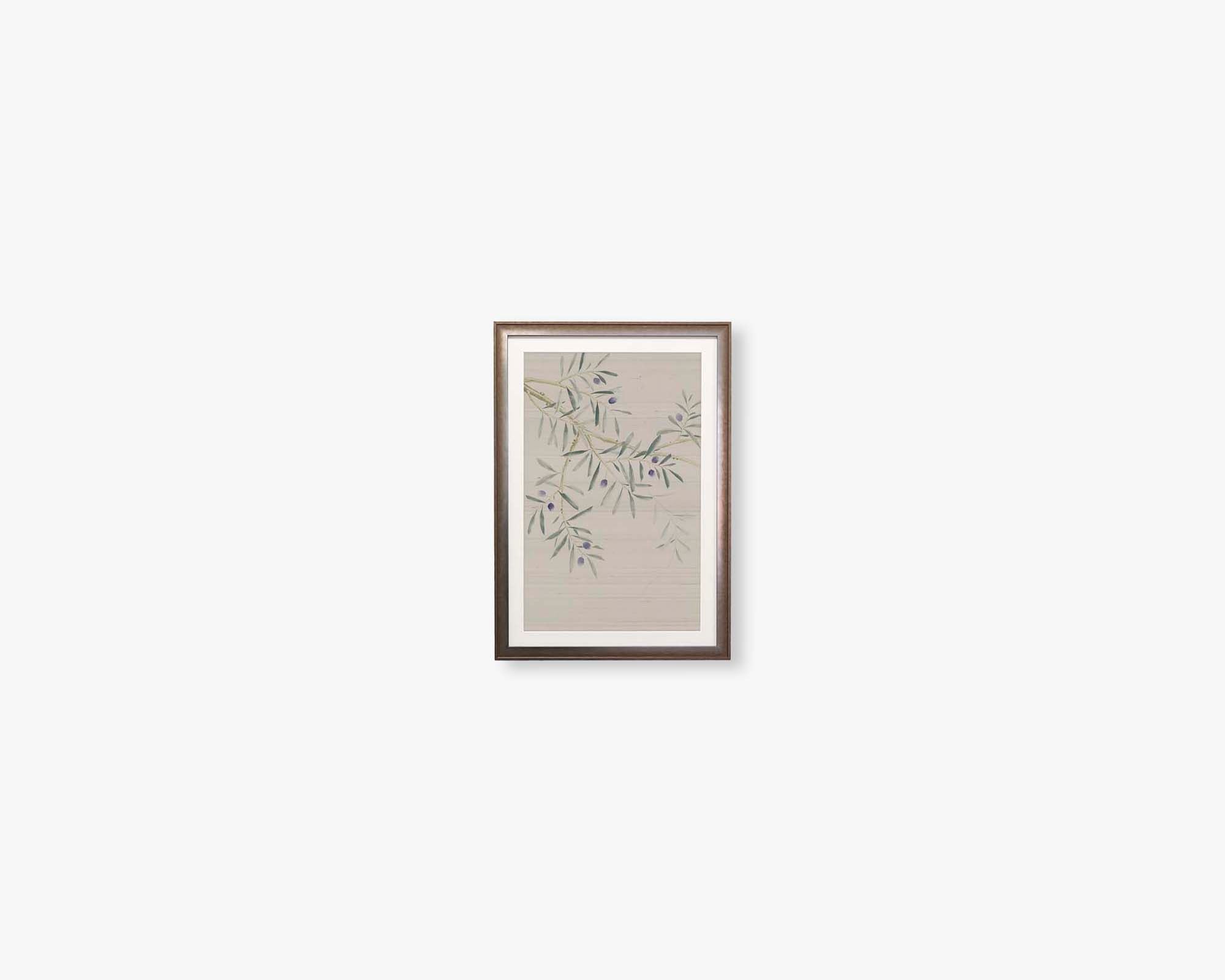 • Known as the tree of peace and eternity, the olive tree’s significance is firmly rooted in Ancient Greek tradition and mythology. The naturalistic Chinese painting style captures the delicate vines winding across the silk and branches bearing olives.