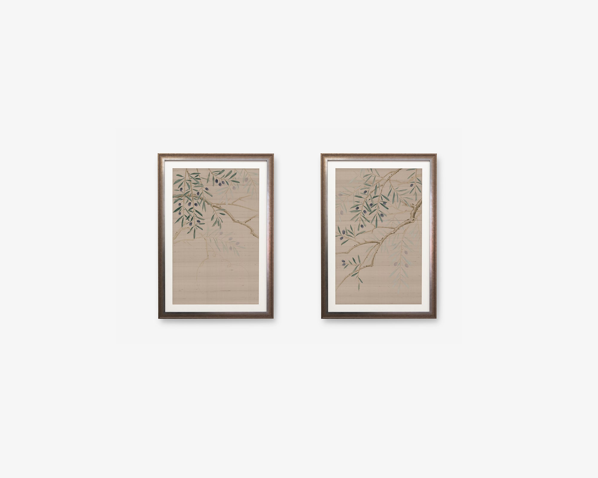 • Known as the tree of peace and eternity, the olive tree’s significance is firmly rooted in Ancient Greek tradition and mythology. The naturalistic Chinese painting style captures the delicate vines winding across the silk and branches bearing olives.