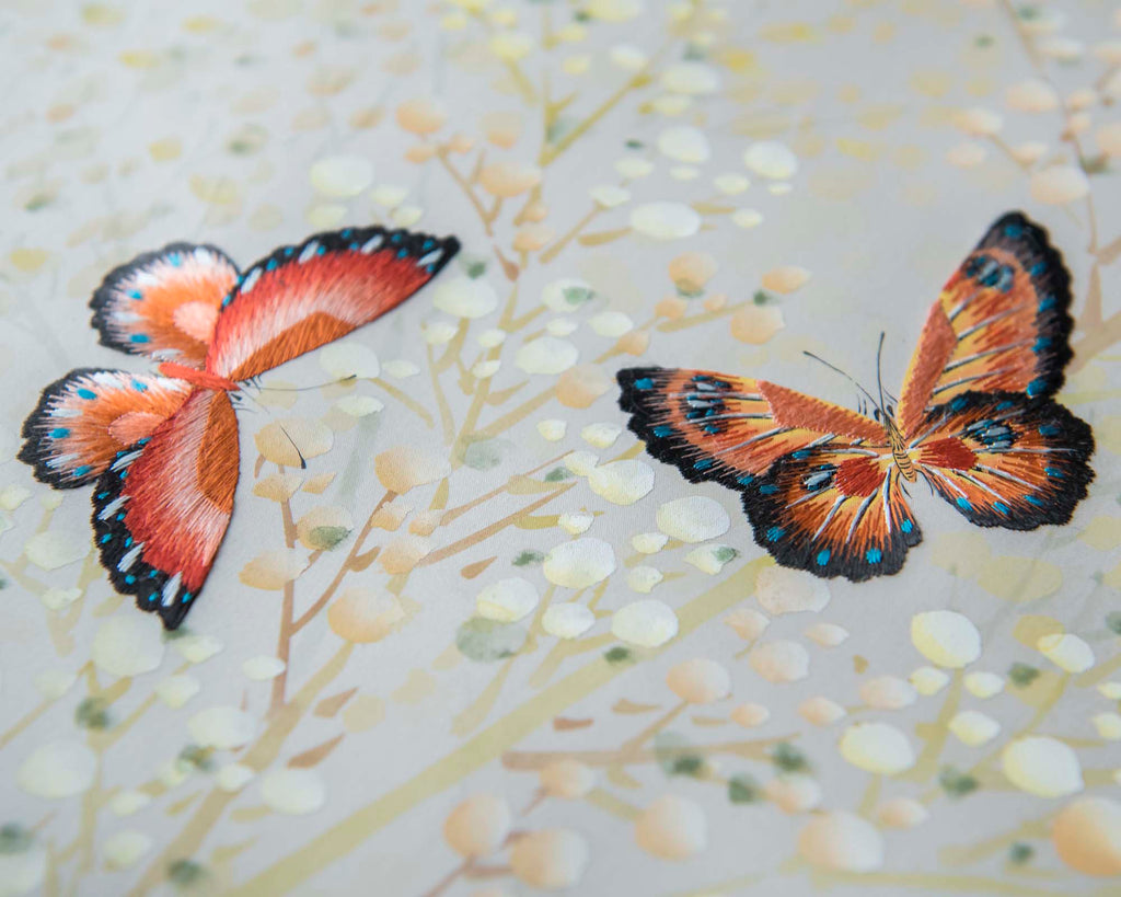 Palladium plays elegantly with subtle shifts in hue, showcasing the interplay between silk, embroidery and paint. This nuanced approach to shading lends an elegant, dreamy quality.