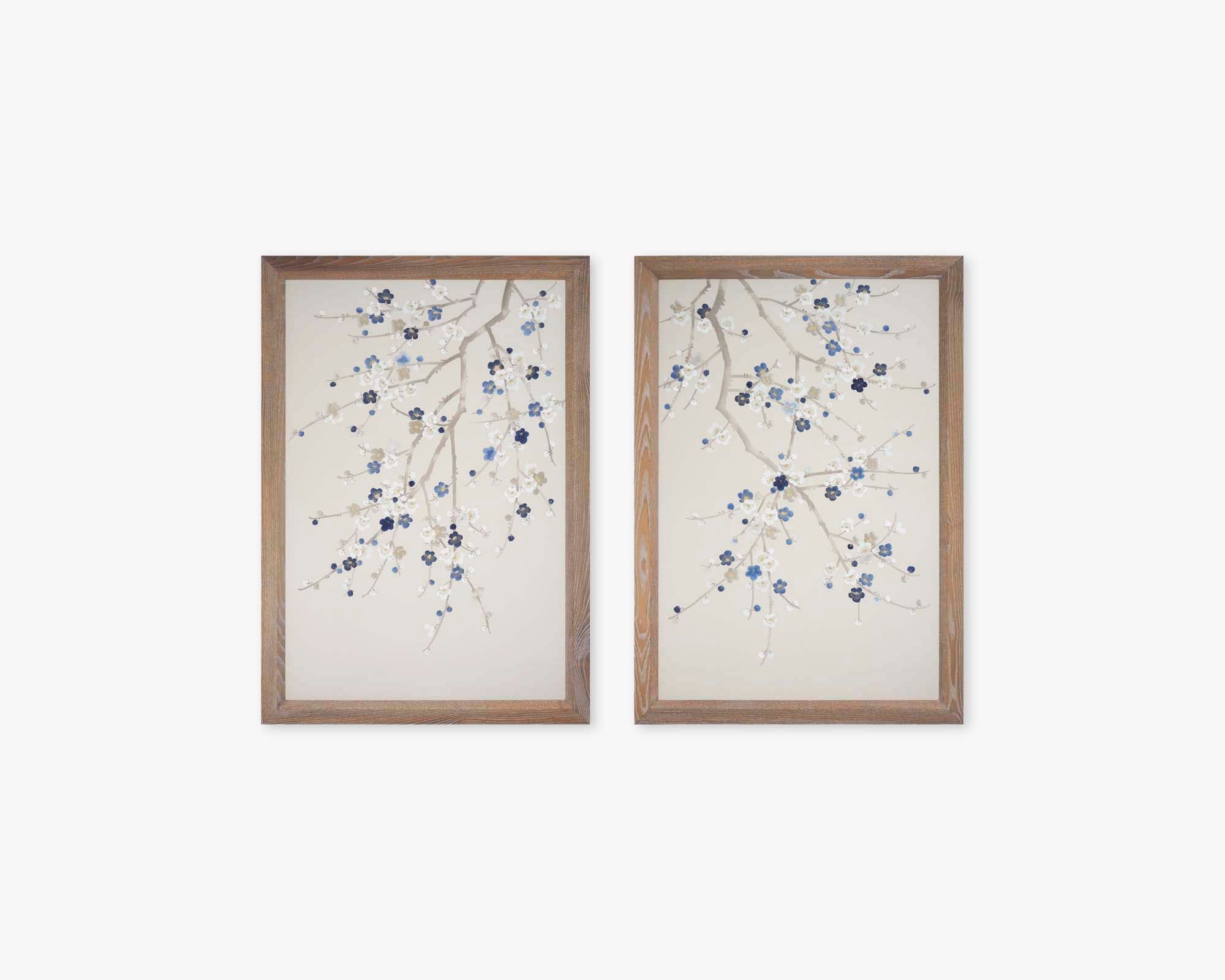 Blue Song manages to be at once elegant and bold. Softly rendered branches almost blend into our metallic Strontium Strata wash, the contrasting blue and white blossoms bringing a sense of vitality.