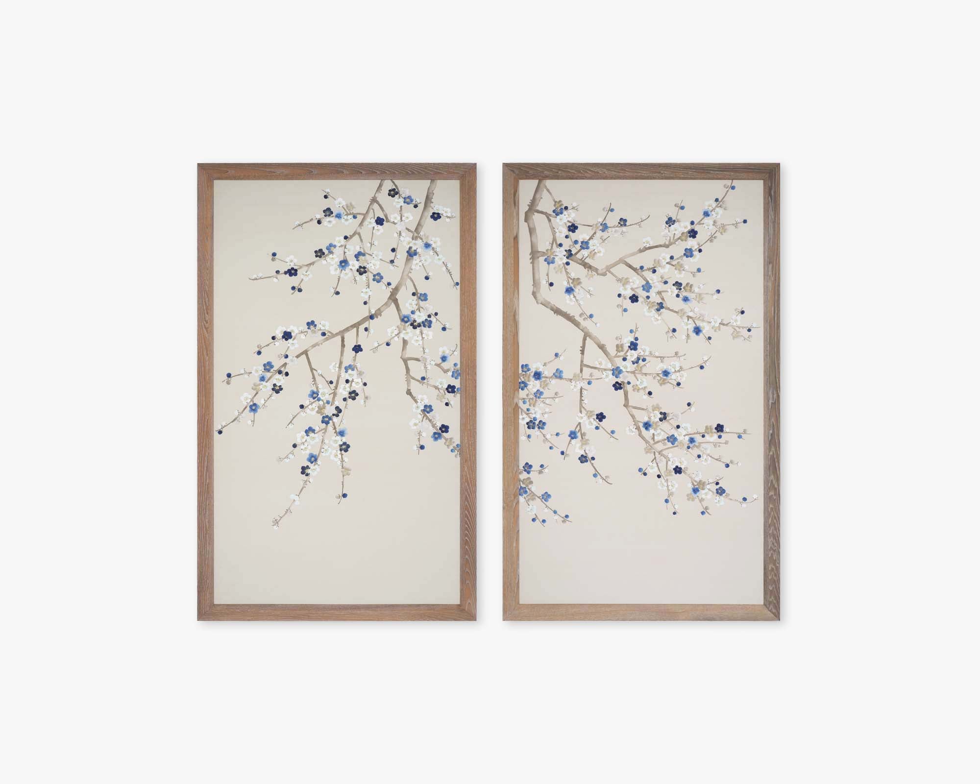 Blue Song manages to be at once elegant and bold. Softly rendered branches almost blend into our metallic Strontium Strata wash, the contrasting blue and white blossoms bringing a sense of vitality.