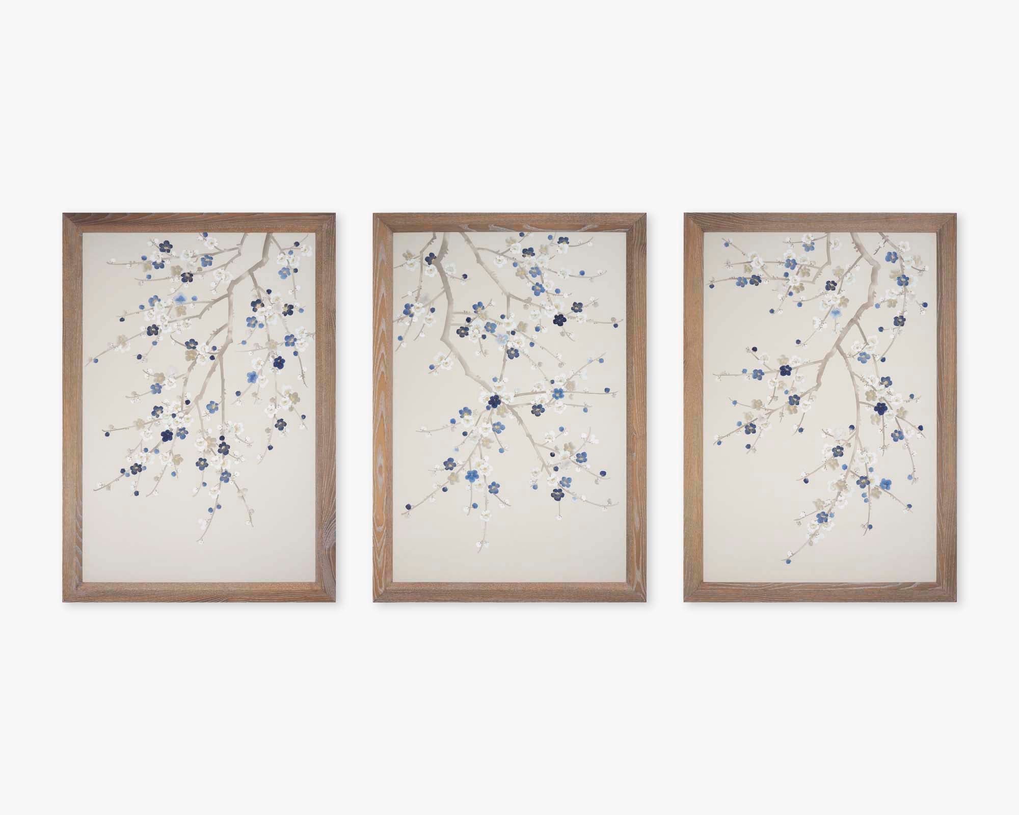 Blue Song manages to be at once elegant and bold. Softly rendered branches almost blend into our metallic Strontium Strata wash, the contrasting blue and white blossoms bringing a sense of vitality.