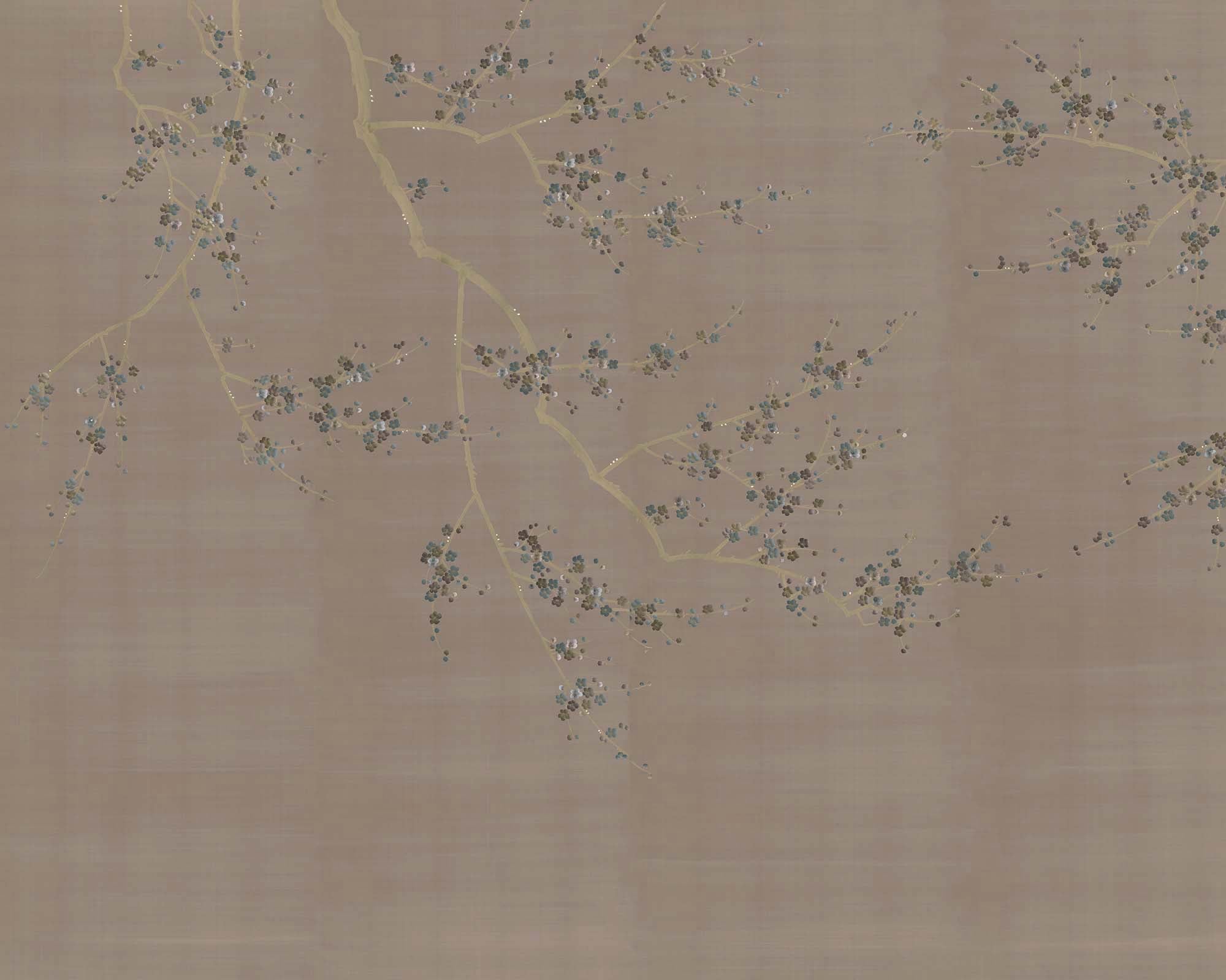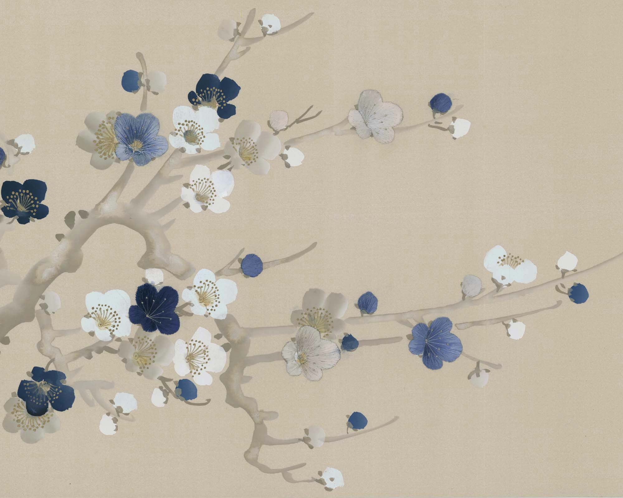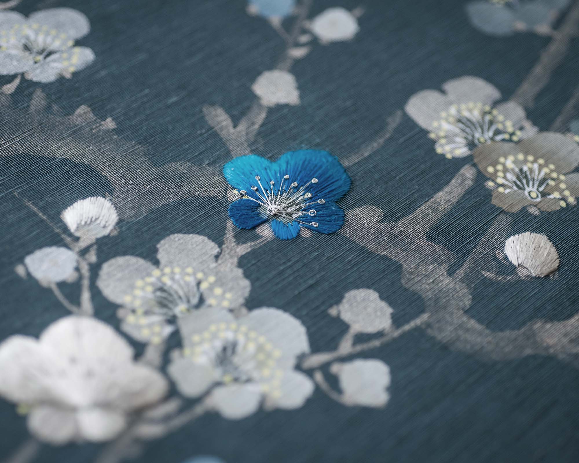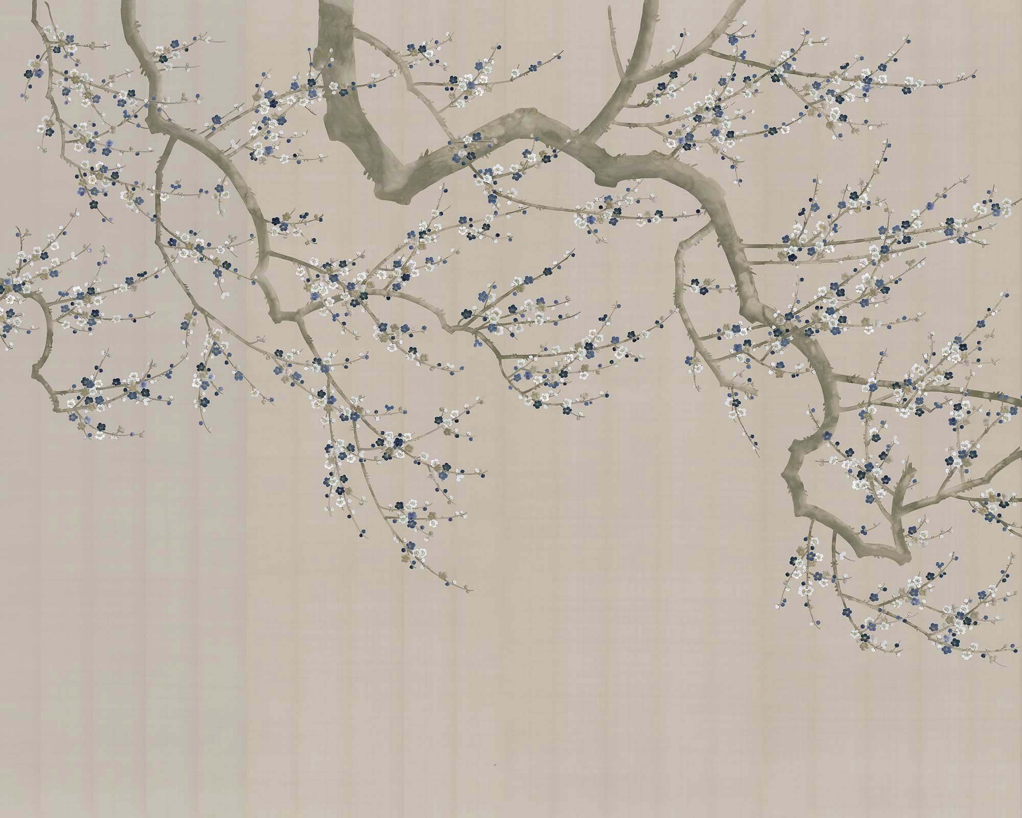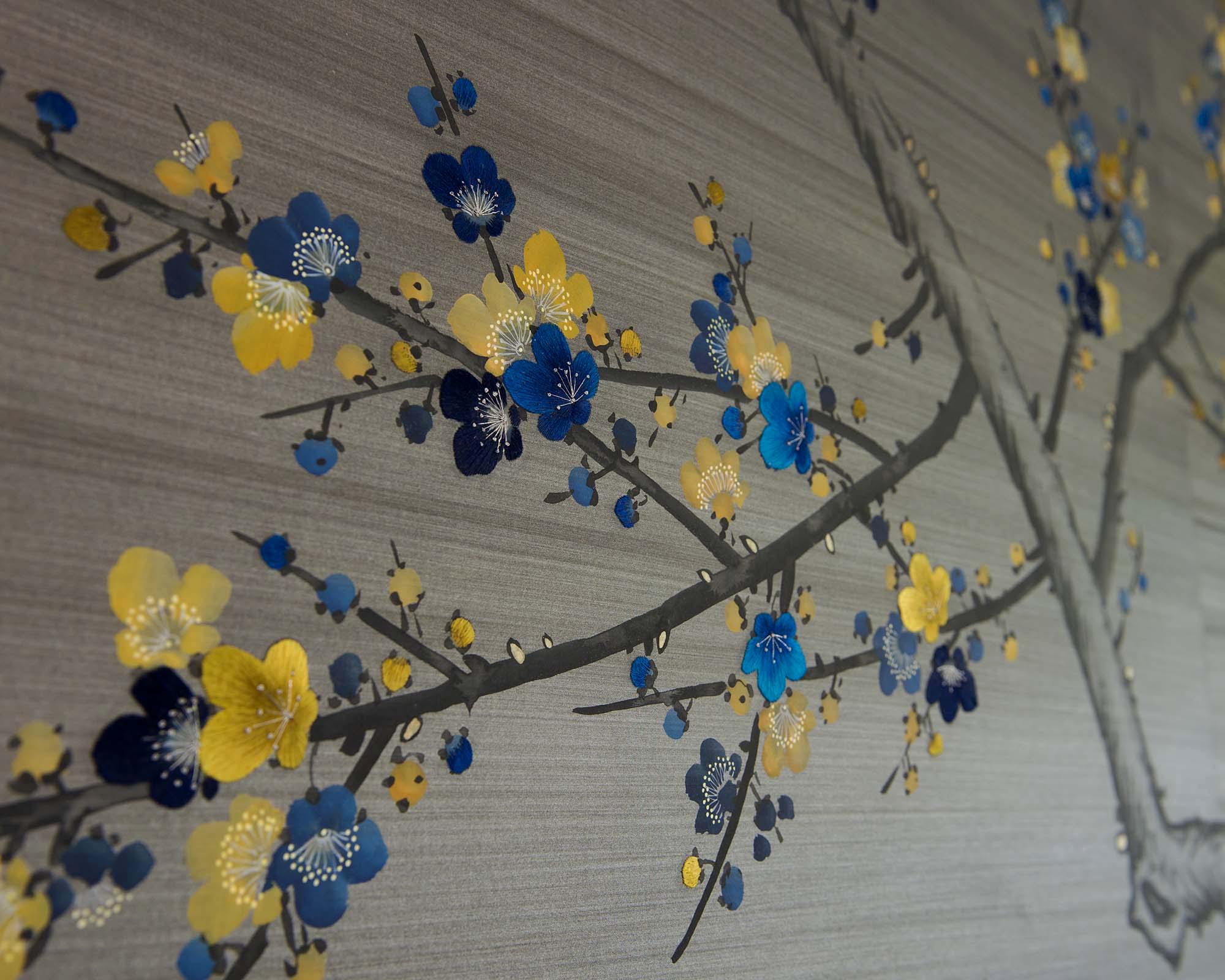 Blue Song manages to be at once elegant and bold. Softly rendered branches almost blend into our metallic Strontium Strata wash, the contrasting blue and white blossoms bringing a sense of vitality.