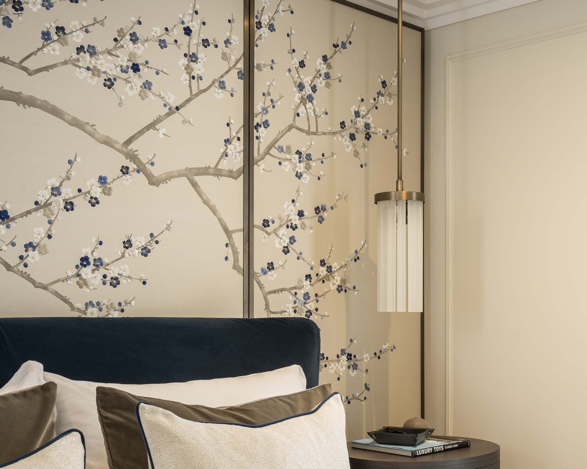 Prunus draws on the rich history of traditional plum blossom painting. A combination of our ‘unconscious’ painting style – which uses graceful, gestural brushstrokes – and the dazzling lustre of the hand-embroidered silk thread gives it an otherworldly beauty. Prunus is a remarkably adaptable design as we offer it in three different layouts. This means you are free to choose the scheme that best suits your space, depending on whether there is low- or high-level furniture, bedside panelling, narrow joinery, etc.
