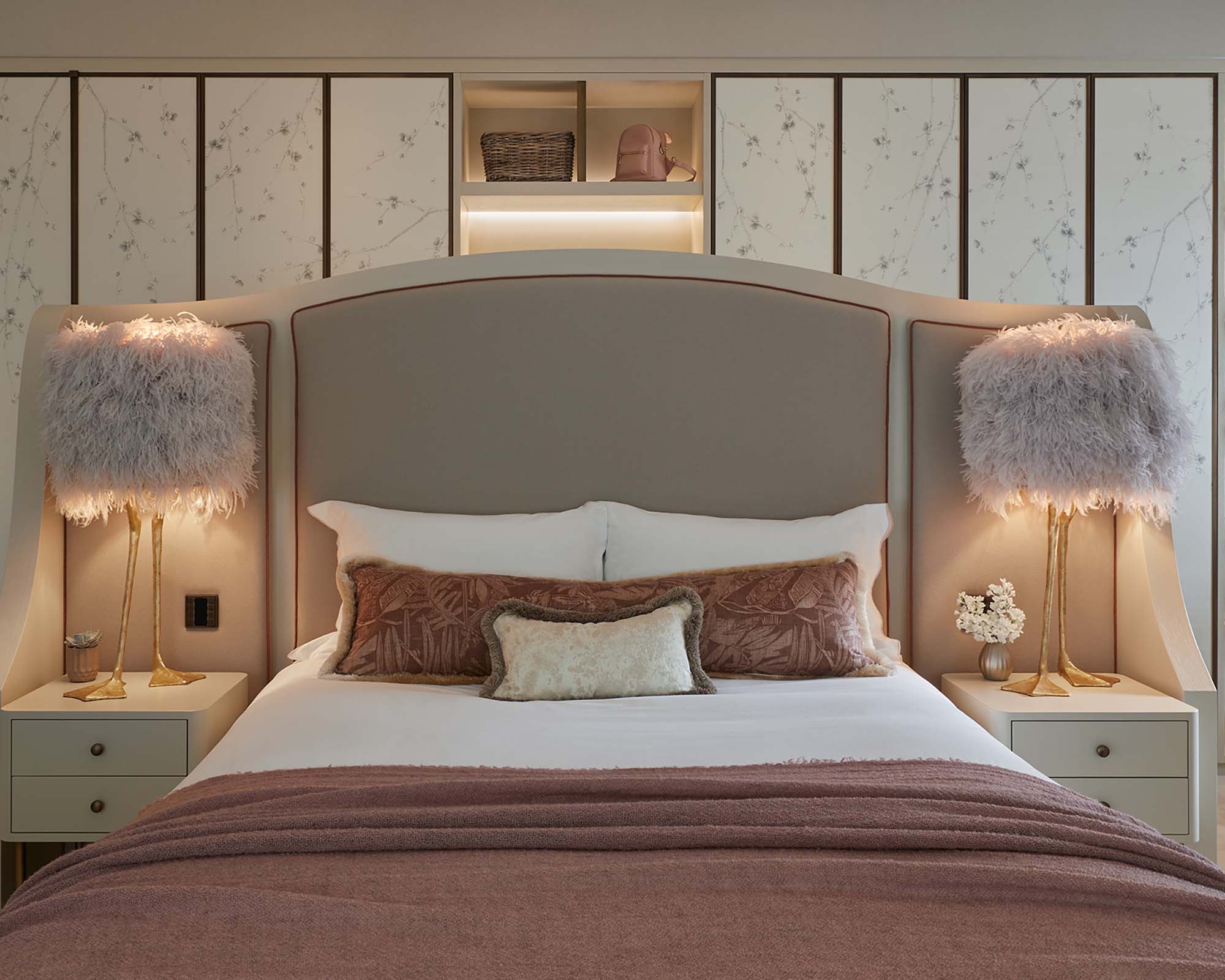 Prunus draws on the rich history of traditional plum blossom painting. A combination of our ‘unconscious’ painting style – which uses graceful, gestural brushstrokes – and the dazzling lustre of the hand-embroidered silk thread gives it an otherworldly beauty. Prunus is a remarkably adaptable design as we offer it in three different layouts. This means you are free to choose the scheme that best suits your space, depending on whether there is low- or high-level furniture, bedside panelling, narrow joinery, etc.
