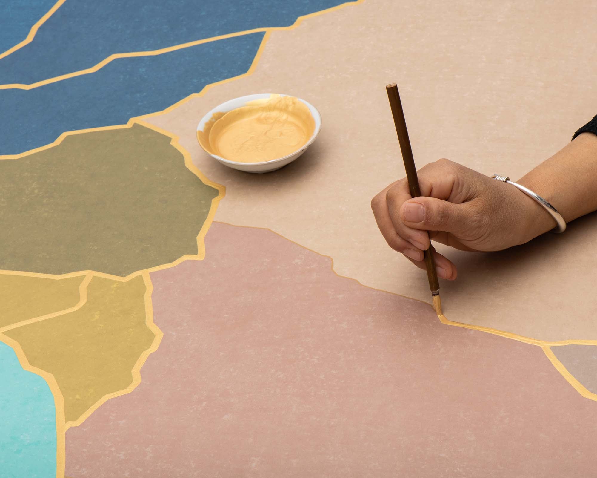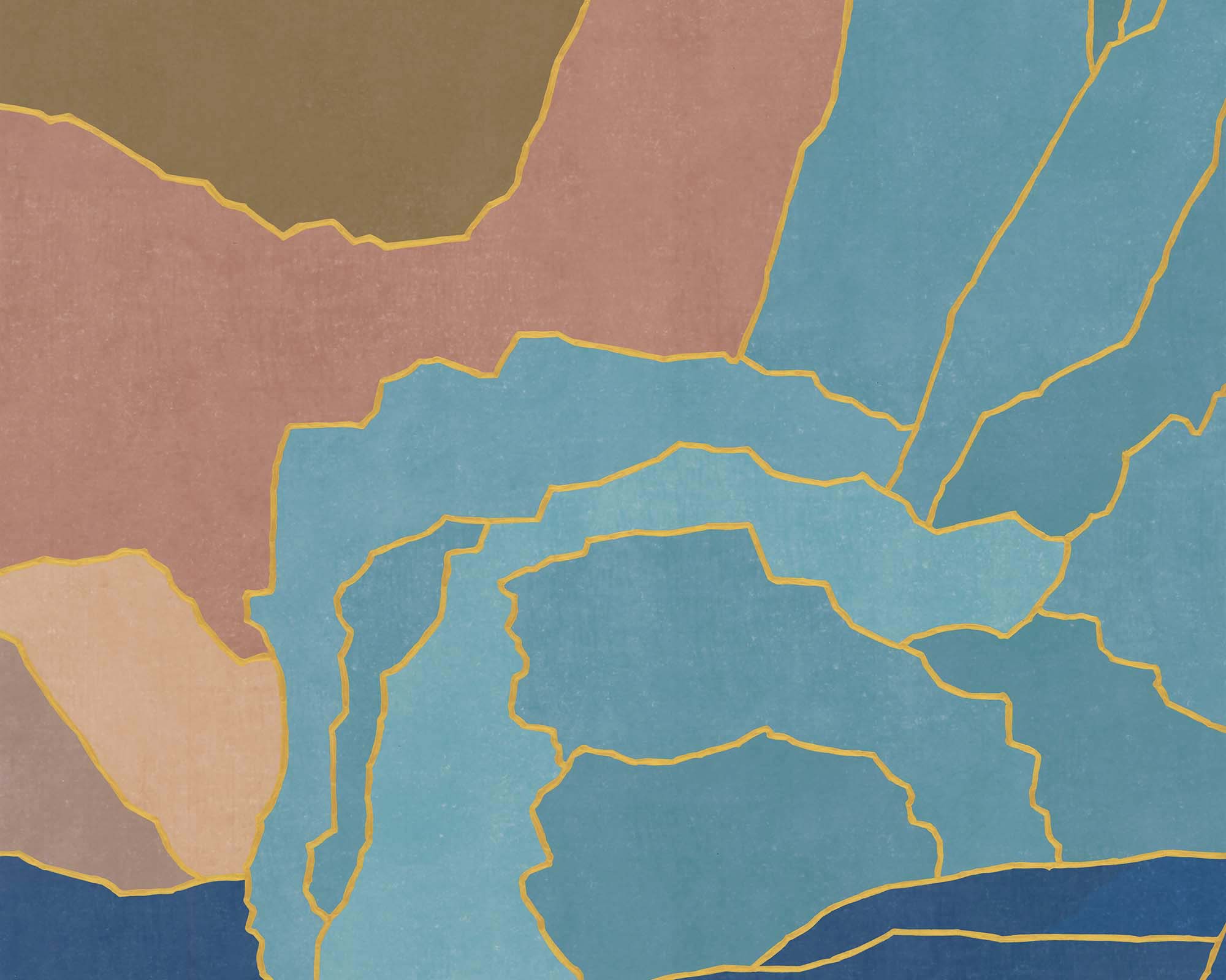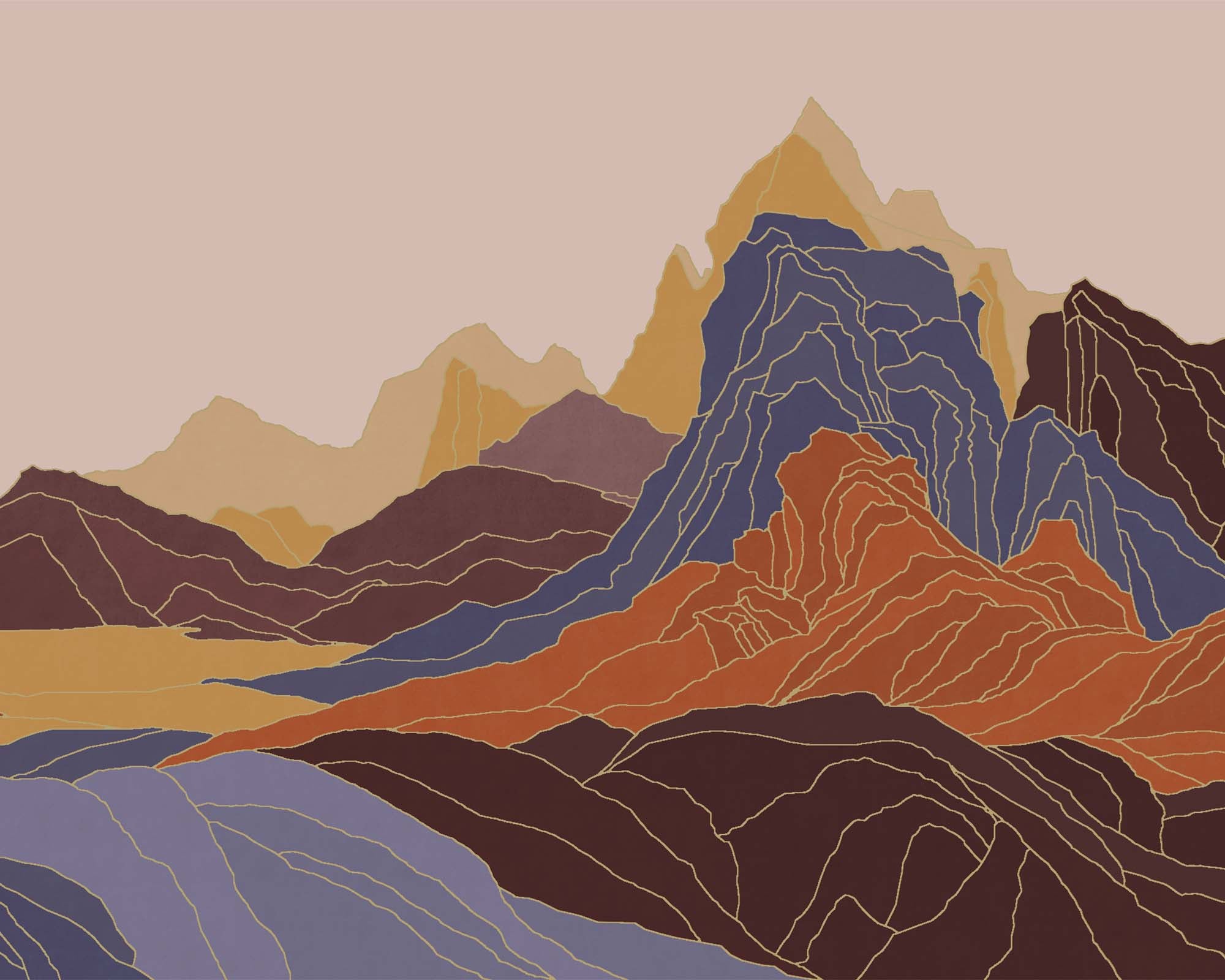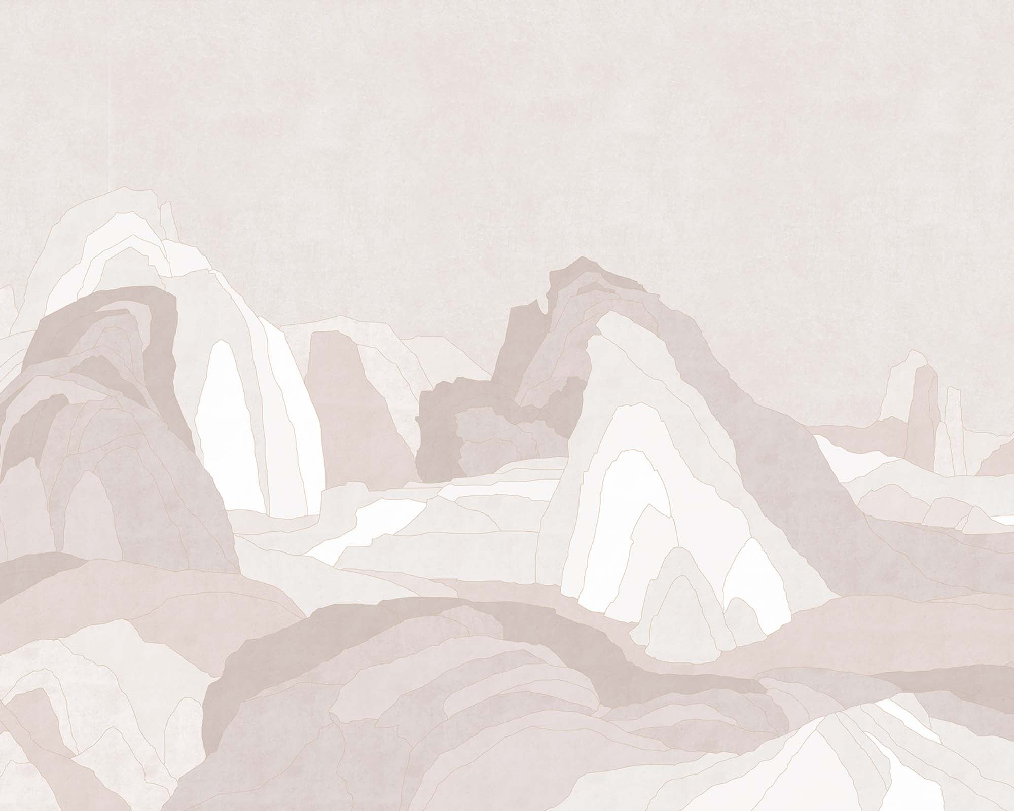 Rockface is a striking depiction of the natural composition and rugged beauty of the mountainscapes of California. The rawness of the subject matter is captured in the torn collage technique. Overlaid sheets of hand-dyed and lacquered paper are finished with hand-painted details. The design works simultaneously as an elegant backdrop and bold statement piece.