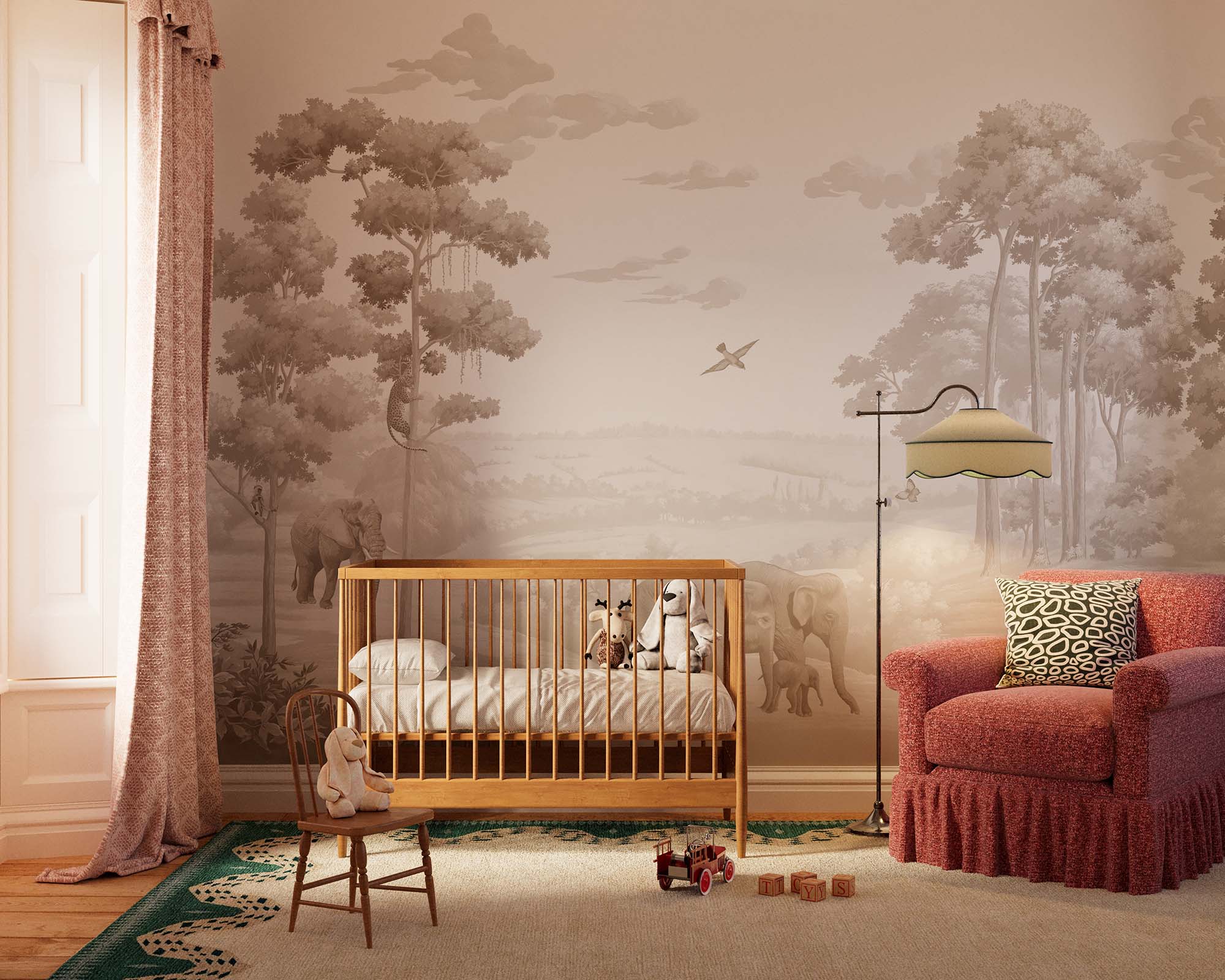 “I wanted to create a wallpaper that was both whimsical and stimulating for a toddler and would also transition into childhood and beyond. I'd happily have this wallpaper in my own room. At first glance it is very sophisticated and restful – the animals are fun, playful details.” – Sophie Paterson