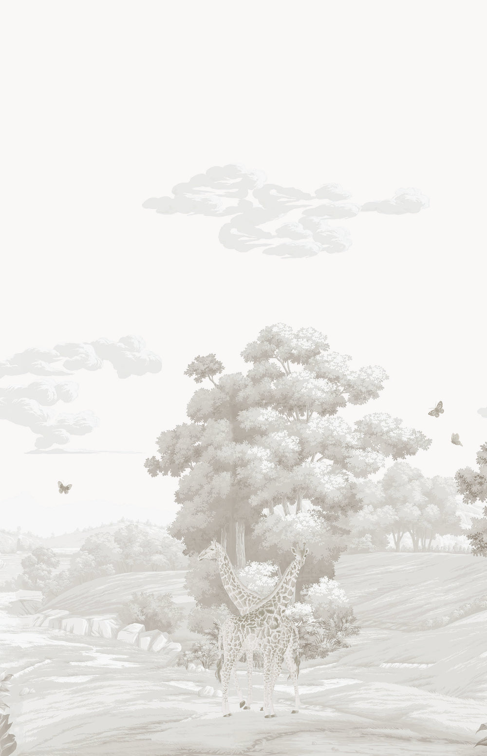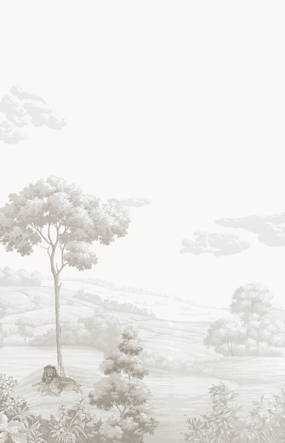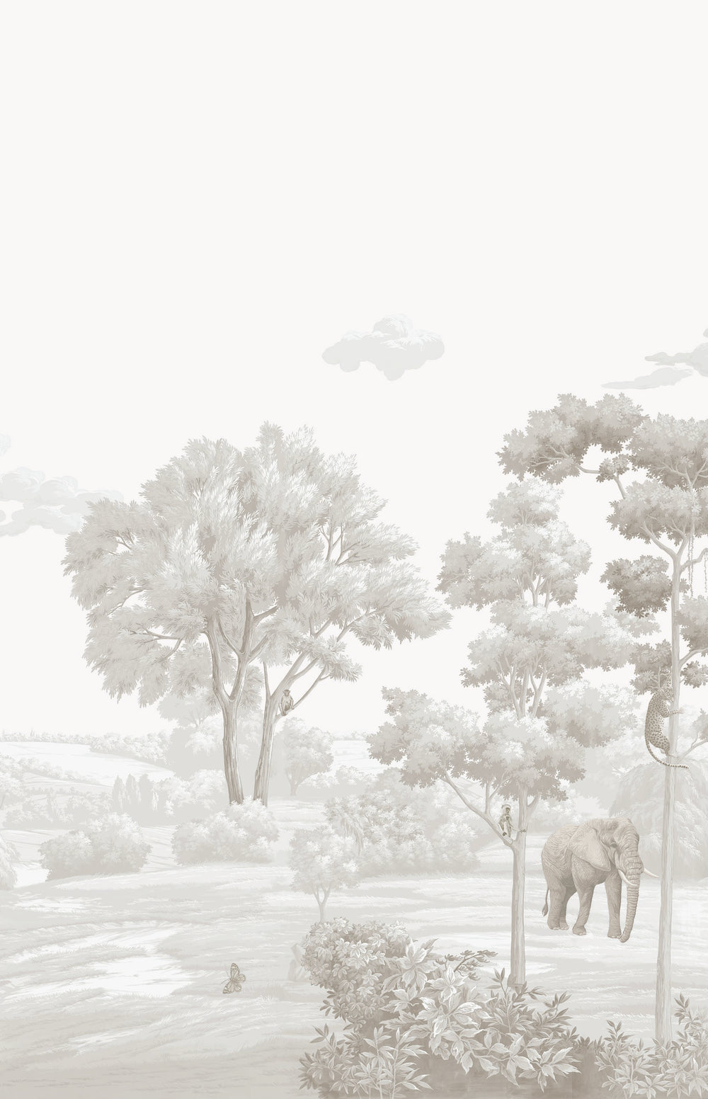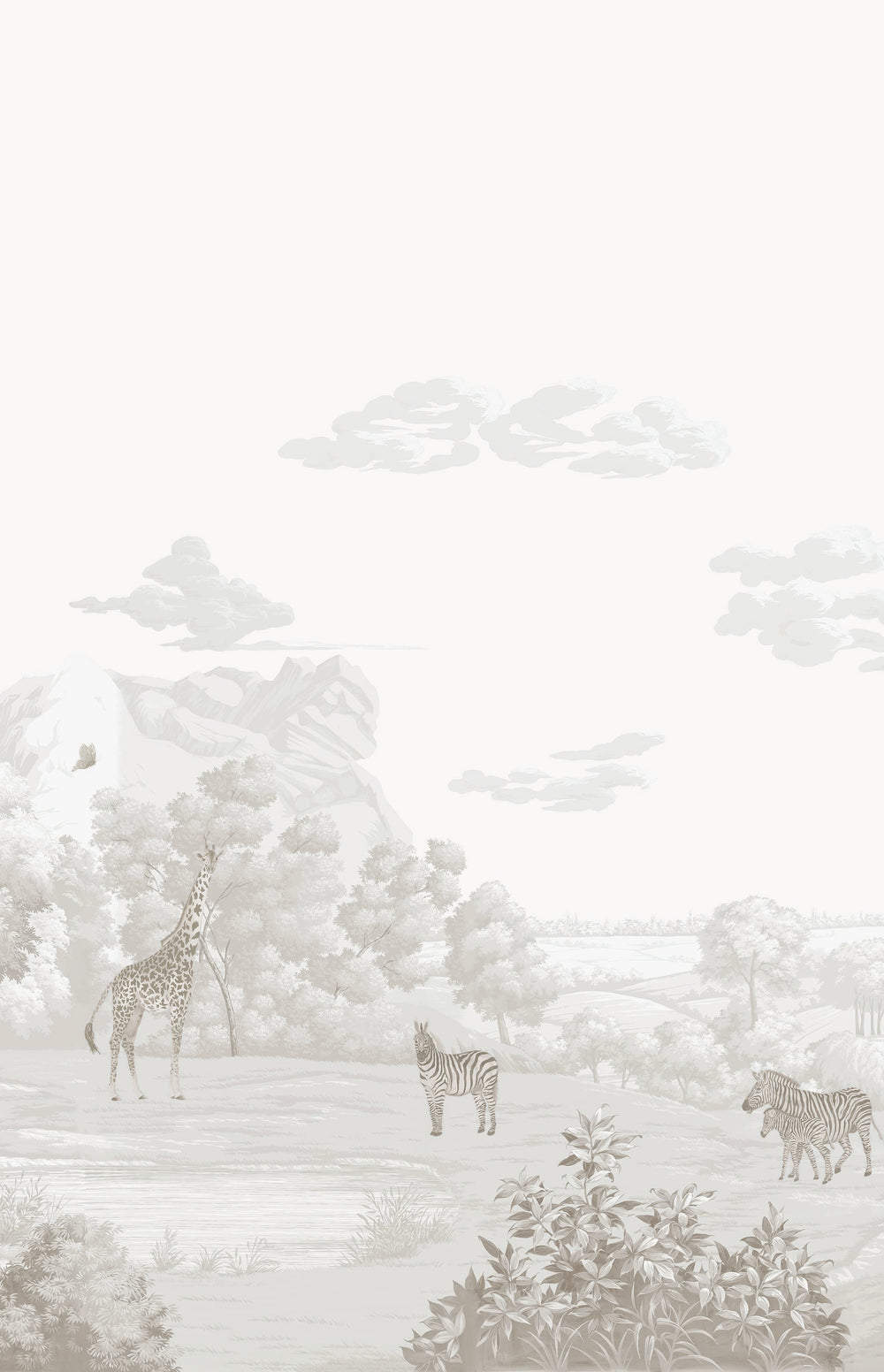 Based on the original hand-painted scenic, Safari reimagines a classic landscape with a modern, playful twist. A pastoral setting unfolds across the design, animated by an array of exotic wildlife — from majestic peacocks and striking giraffes to families of elephants.