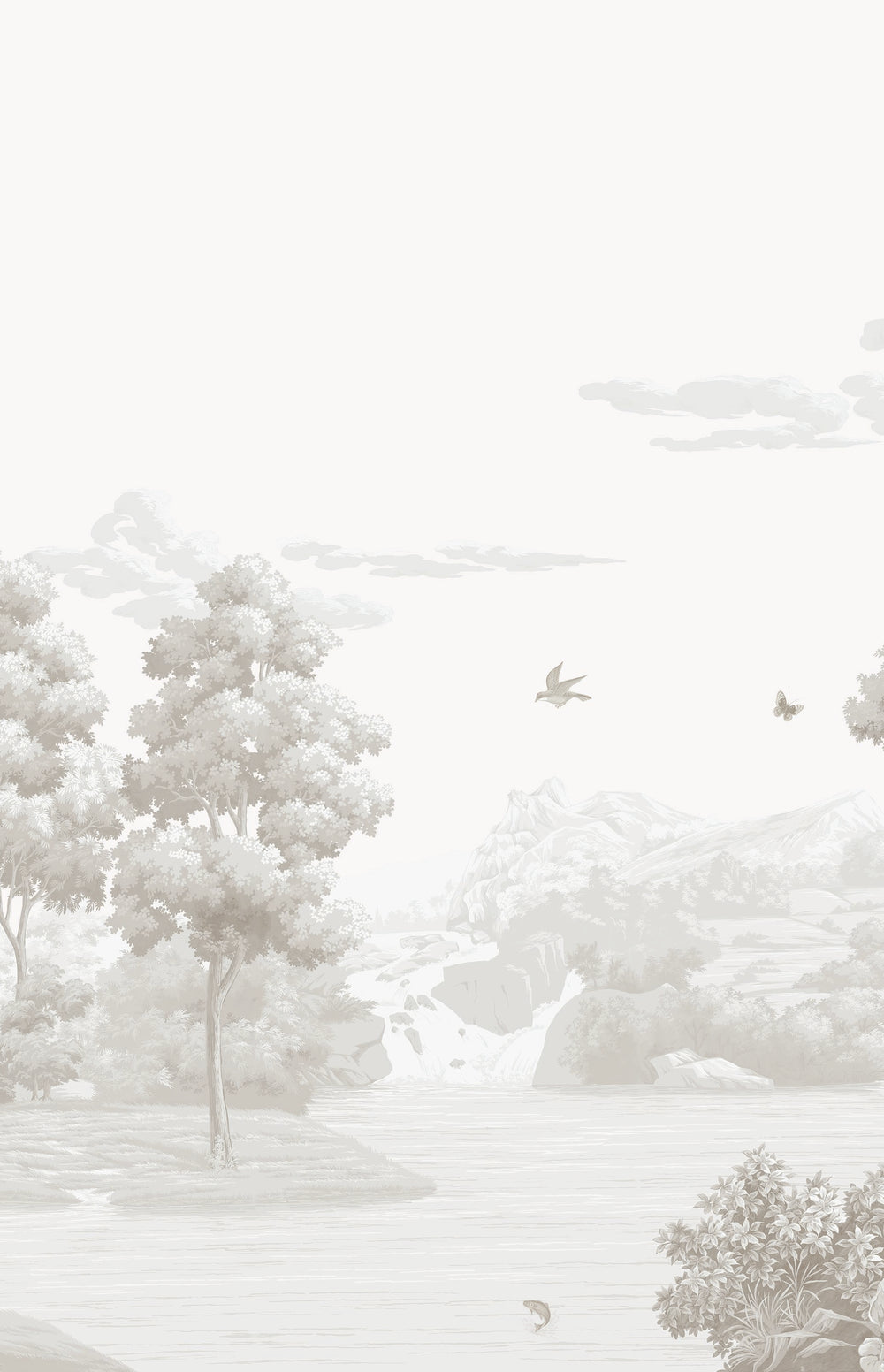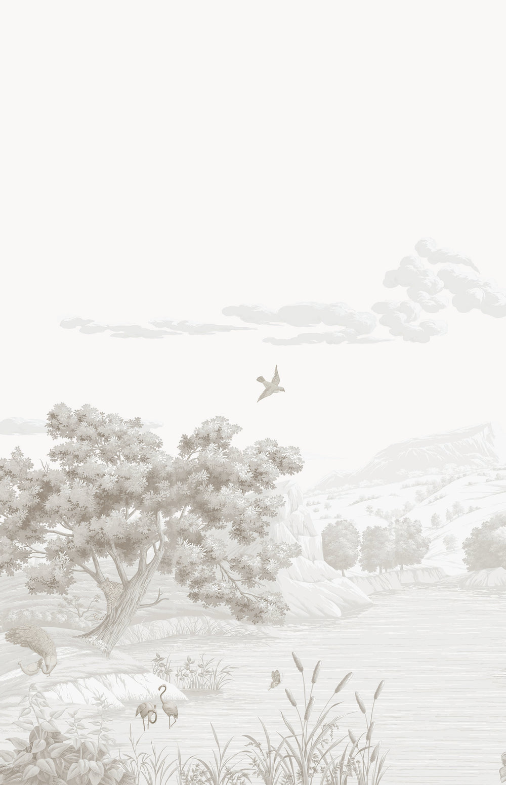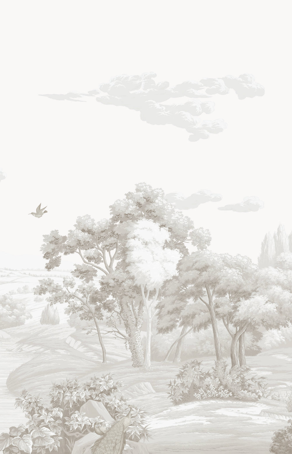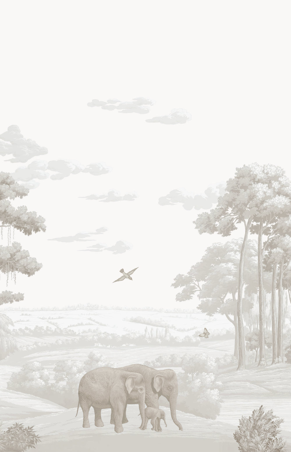 Based on the original hand-painted scenic, Safari reimagines a classic landscape with a modern, playful twist. A pastoral setting unfolds across the design, animated by an array of exotic wildlife — from majestic peacocks and striking giraffes to families of elephants.