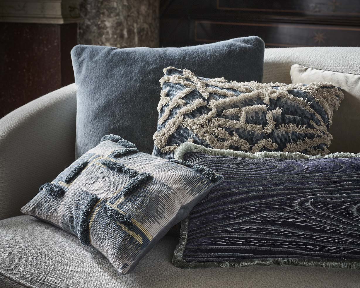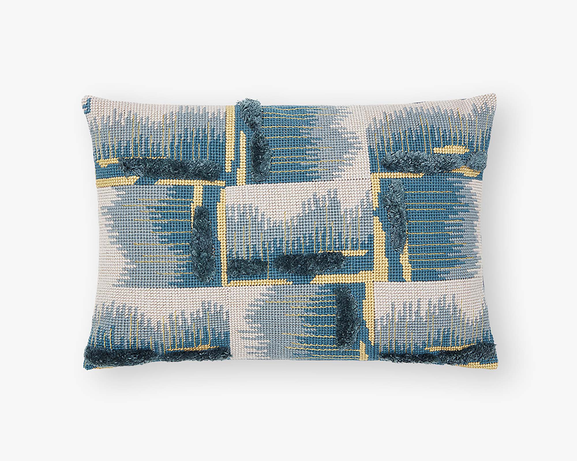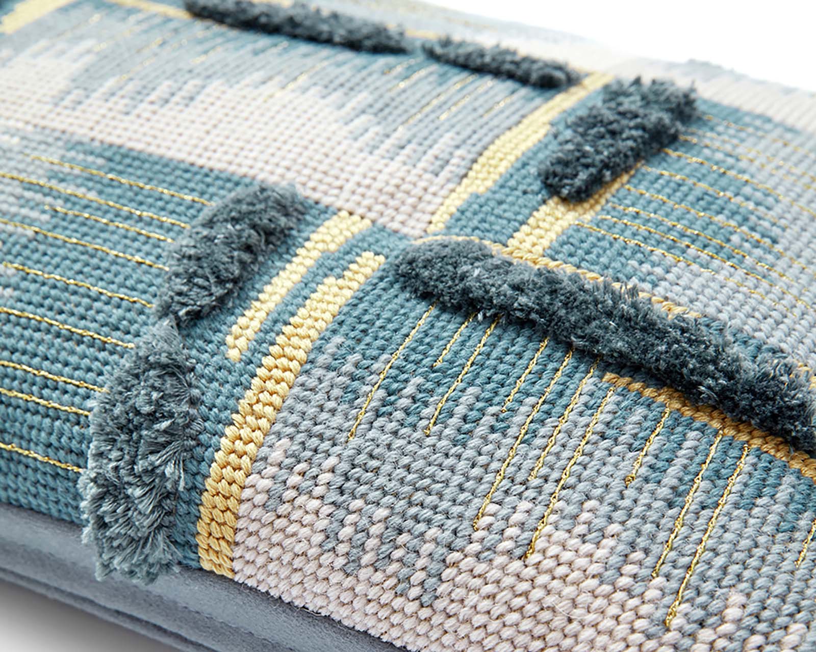 The design, created here in needlepoint, showcases many styles of stitching and over-embroidery to interpret the lines and textures in the original woodblock print. Drawing from the colours in the original woodblock print that inspired our Ukiyo-e cushion, Storm Blue combines soft blues and greys with details in gold.