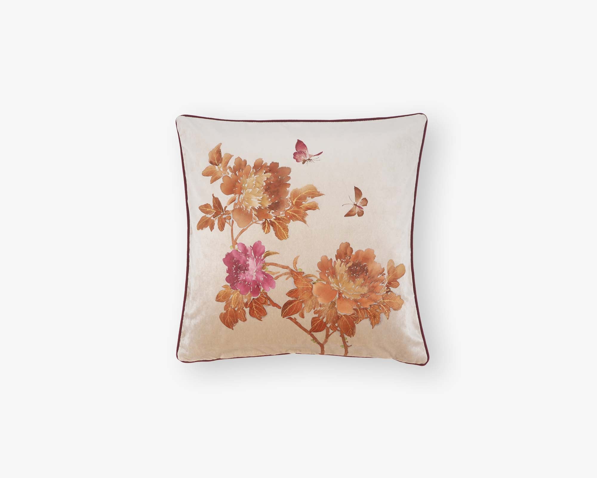 Capturing the romantic grandeur of full-bloomed peonies, in this design generous clusters of hand-painted flora unfurl across sumptuous velvet in a dreamy, unstructured composition.