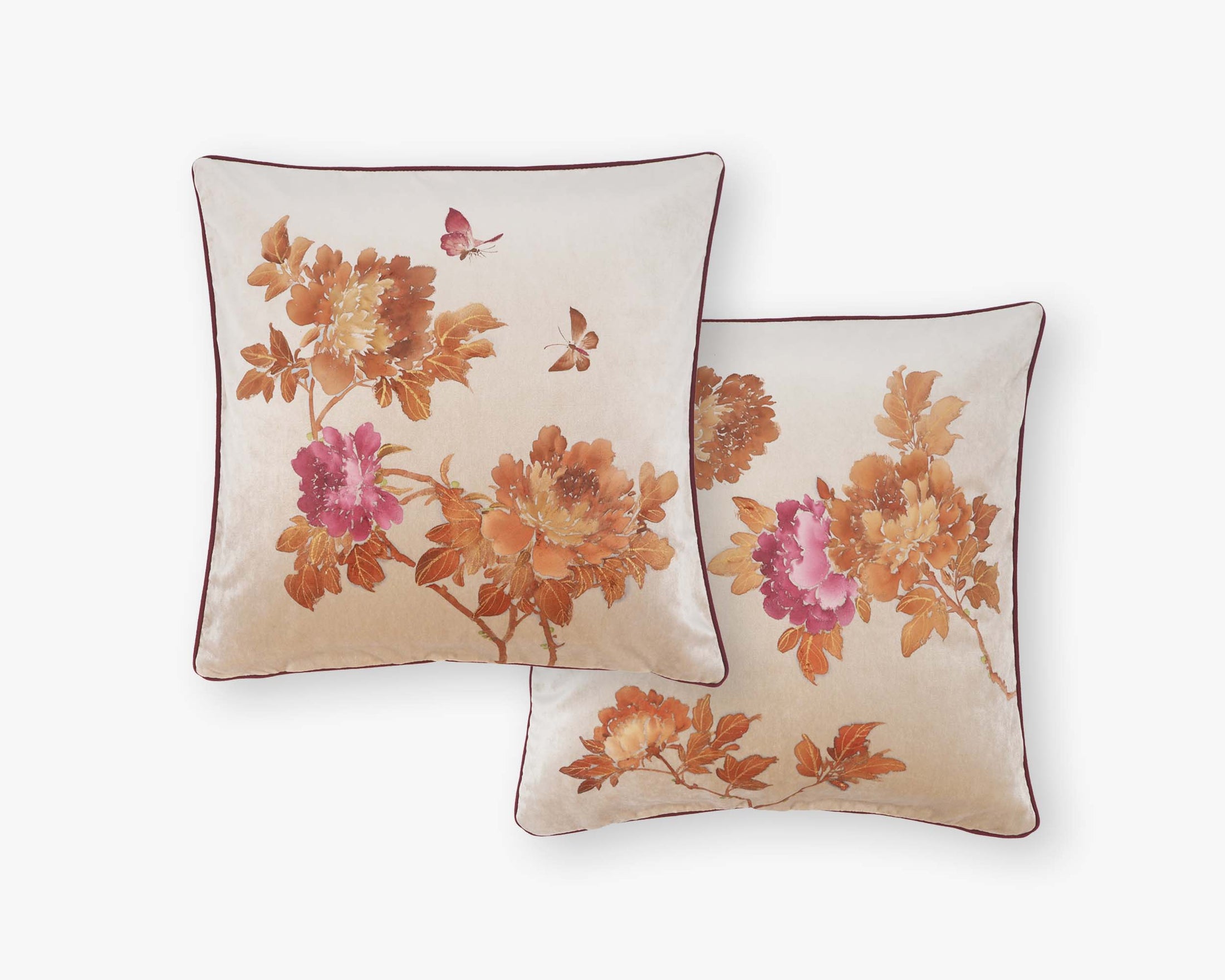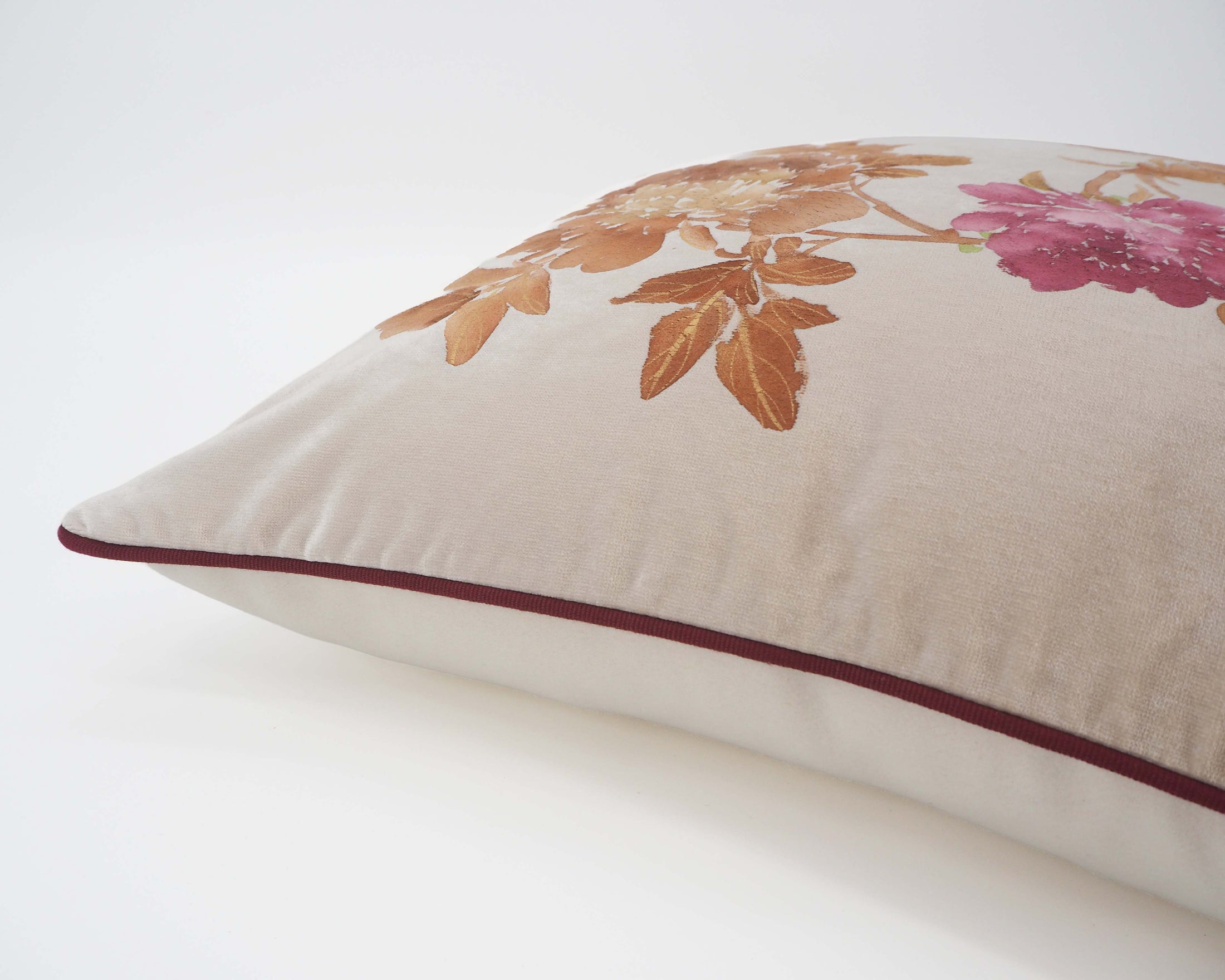 In Terra Rose, warm rose and burnt sienna bloom against soft cream velvet, where earthy tones create a grounded, autumnal elegance.