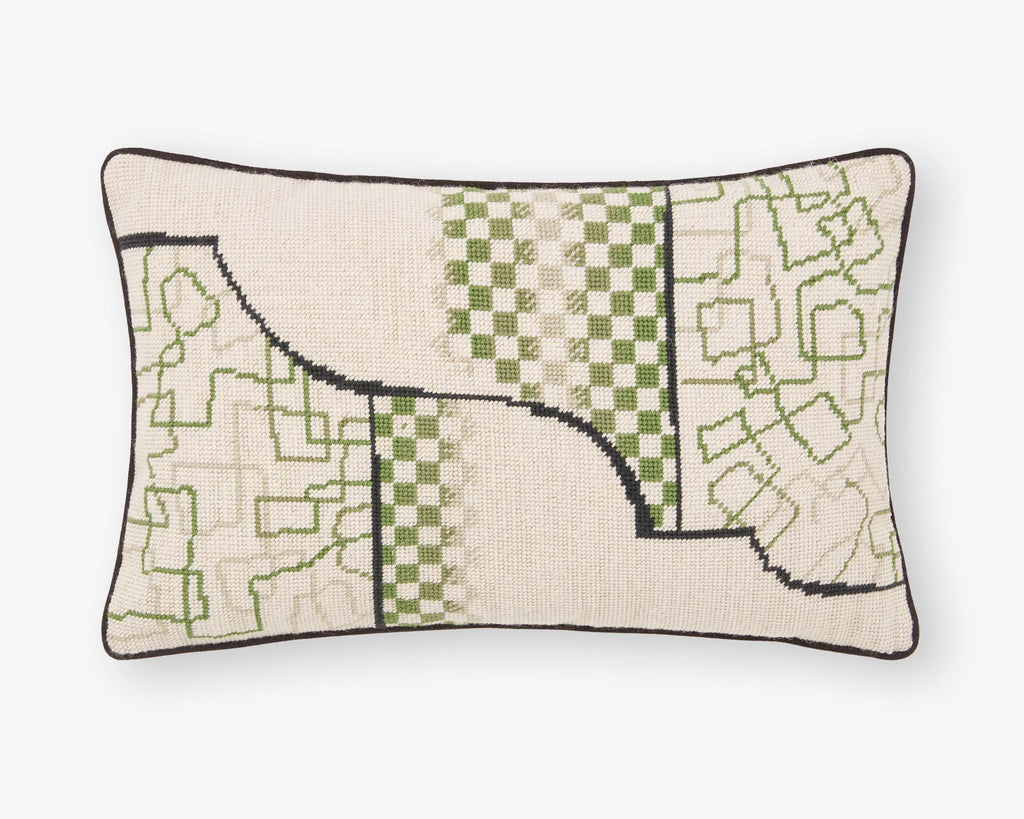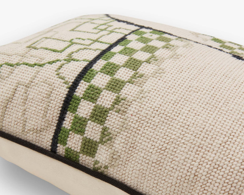 Our Woodgrain cushion is inspired by some beautiful oak floorboards at our co-founders Tim and Lizzie’s home. These boards have had their grain blasted, then filled with gold, before being stained and varnished. Now crystalised in cushion-forn, the pattern is depicted using a silk velvet with cotton over-embroidery.