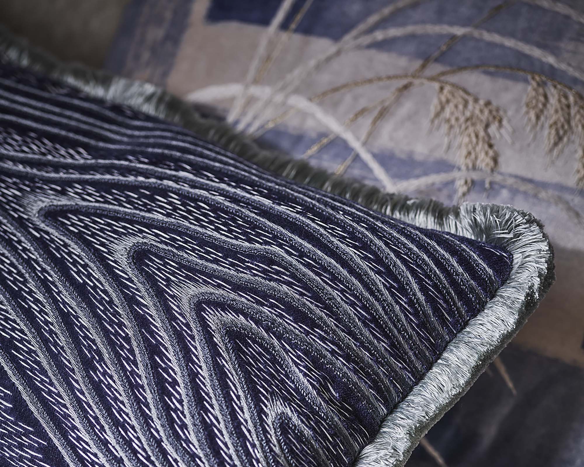 A background of cream silk velvet plays host to details in shades of chestnut, lending contrast and definition to our Woodgrain design. Presented in Blue, details rendered in pale, sagey greens and off-white contrast dramatically with a dark blue background in silk velvet.