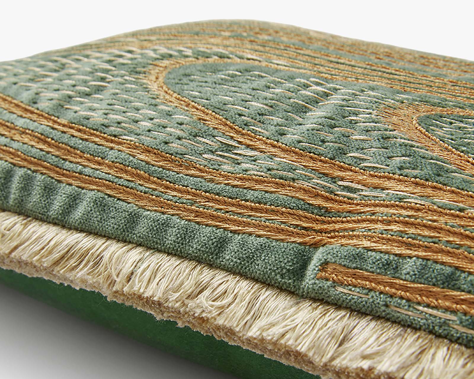 Our Woodgrain cushion is inspired by some beautiful oak floorboards at our co-founders Tim and Lizzie’s home. These boards have had their grain blasted, then filled with gold, before being stained and varnished. Now crystalised in cushion-forn, the pattern is depicted using a silk velvet with cotton over-embroidery.